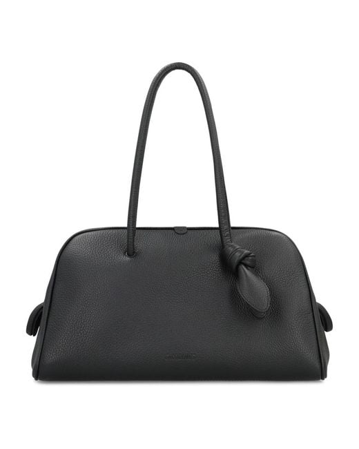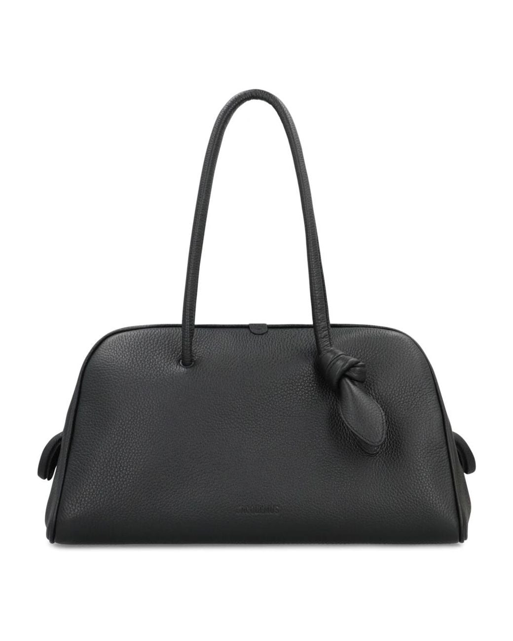 Jacquemus The Turismo Bag is a grained calfskin bowling bag designed for everyday carry. It pairs a roomy main compartment with a bow-accented handle for polished, practical styling. Key attributes: Black | Grained calfskin | Two-way zip closure | Inside zipped pocket | Large patch pocket | Bow detail on handle | Bowling bag shape | Two top handles | Dimensions & fit: 39 cm x 21 cm x 17 cm | Composition & care: 100% Calfskin | Avoid direct and prolonged exposure to light and contact with cosmetics, water or heat. Store in the dust bag in a dry place. Colour: black