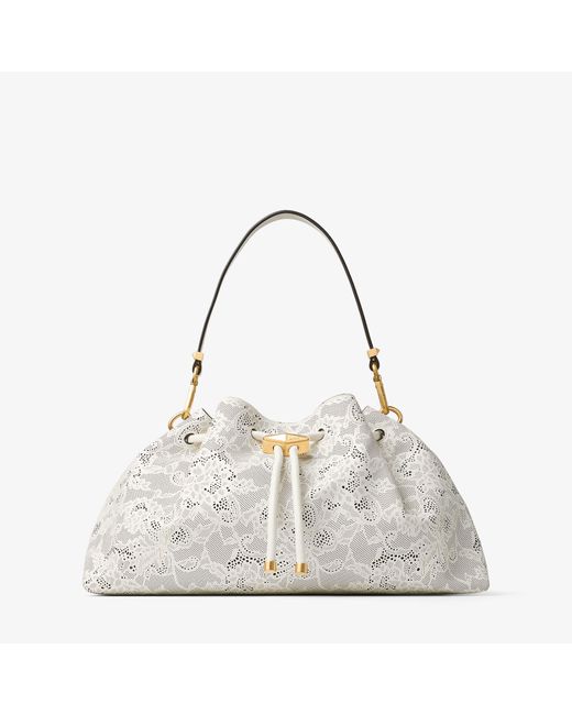 The Cinch M bag is a house signature defined by a soft and effortless silhouette that is "cinched" by a faceted Diamond drawstring closure. This definitive style is crafted from intricate perforated leather lace and Jimmy Choo embroidery and is complemented by antique gold-tone hardware.