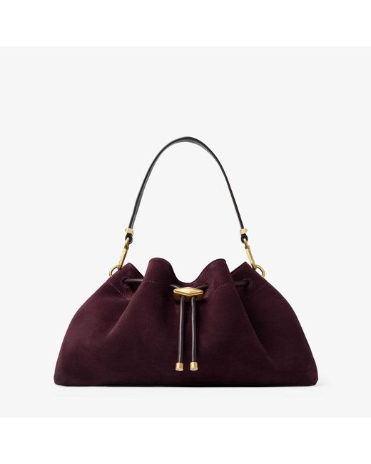 The Cinch bag is a house signature defined by a soft and effortless silhouette that is "cinched" by a faceted Diamond drawstring closure. This definitive style is presented in supple deep merlot suede. It is finished with detachable leather shoulder straps and complemented by gold-tone hardware. Colour: purple