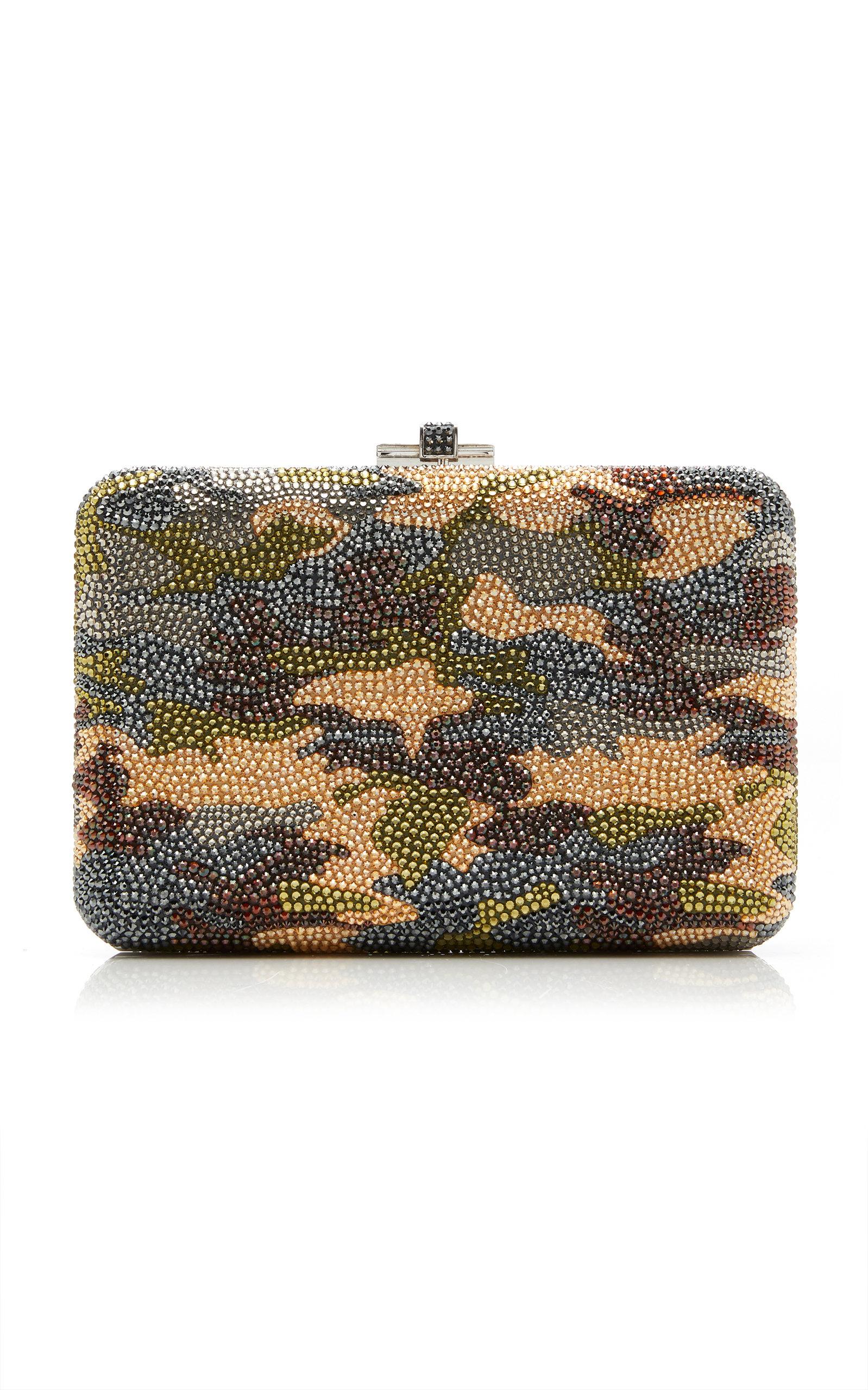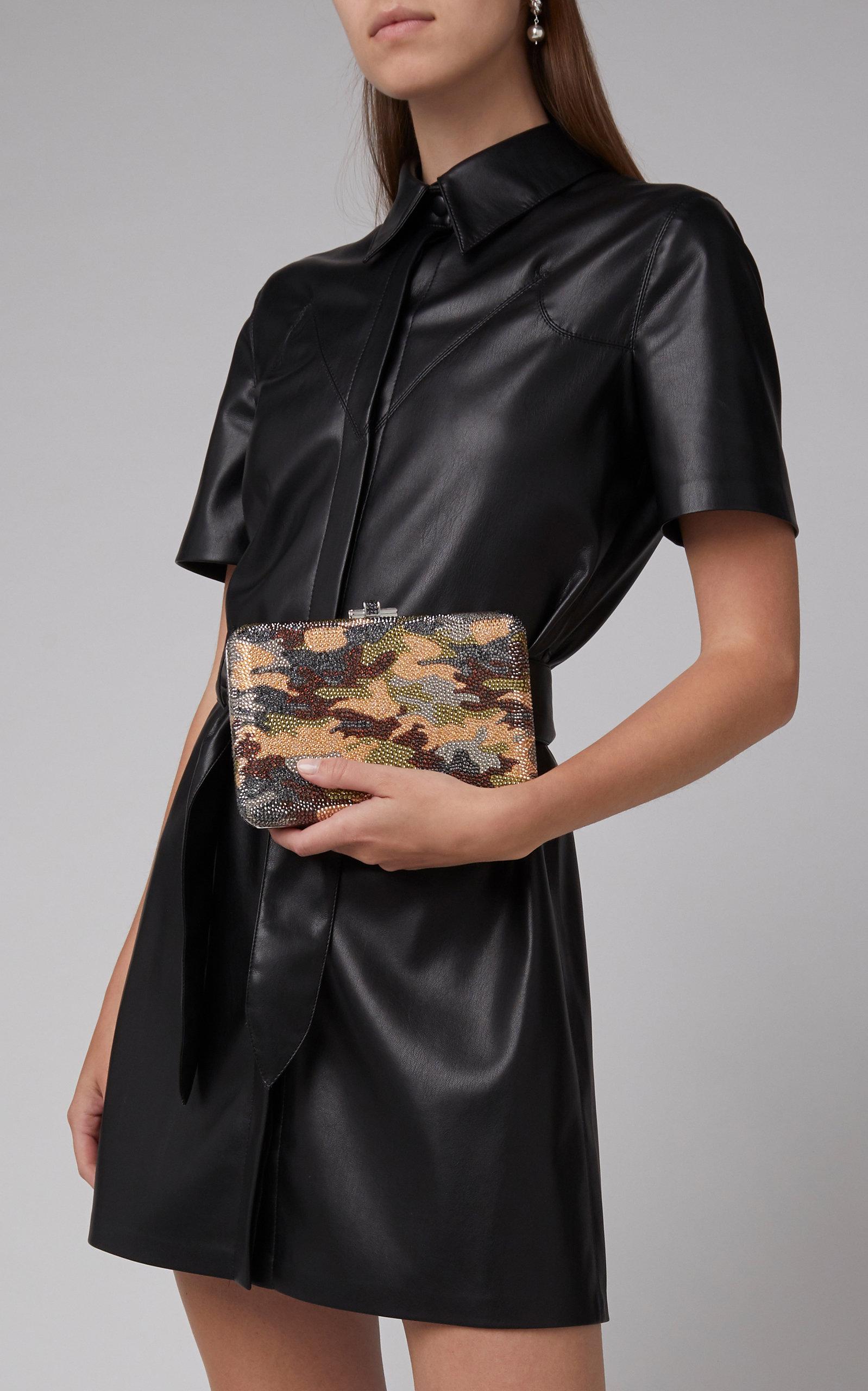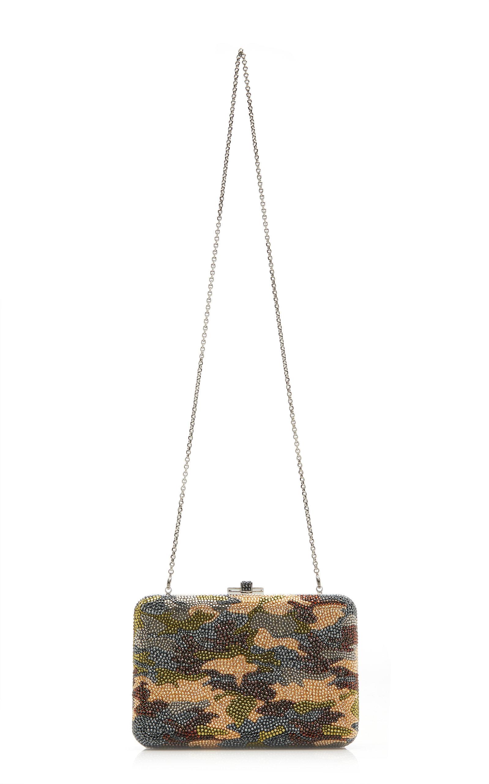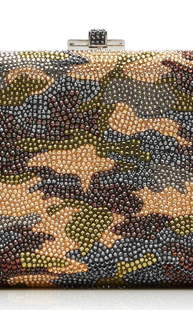 Go to Moda OperandiAs featured in the Resort '20 collection; its vivid camo pattern pairs well with neutral-toned separates. Camouflage design, allover crystal embellishment, compact construction, removable crossbody strap, silver hardware, ships with dust bag, lined. Snap fastening at top. Composition: Austrian crystals. Made in Italy.