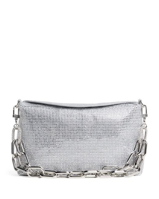 Evoking the disco glamour of the ‘80s, Judith Leiber’s Bowie shoulder bag is perfect for dance floors and elegant events alike. In the label’s signature fashion, the slouchy silhouette is realised with all-over crystals that catch the mirrorball lights, while a chunky chain strap adds a maximalist edge. Colour: grey