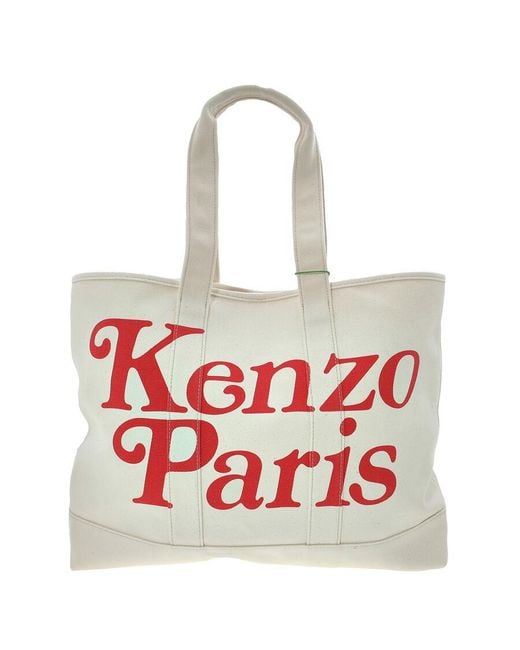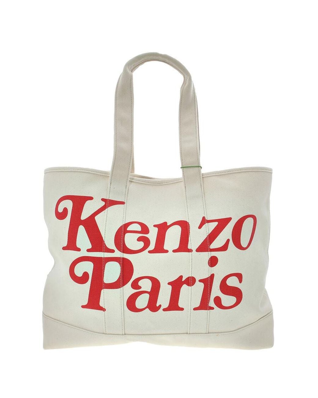 Kenzo Mens Tote. SKU: FE58SA911F35-3. Color: Beige. Kenzo Printed Logo Tote Bag. This tote bag features cotton canvas with two flat shoulder straps, a logo print on the front, and a slogan print on the rear. It has a main compartment and an internal zip-fastening pocket. 100% cotton. Made in China. Colour: red