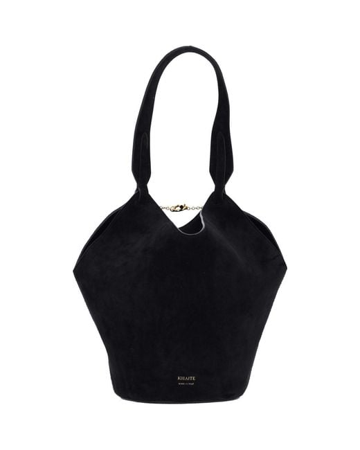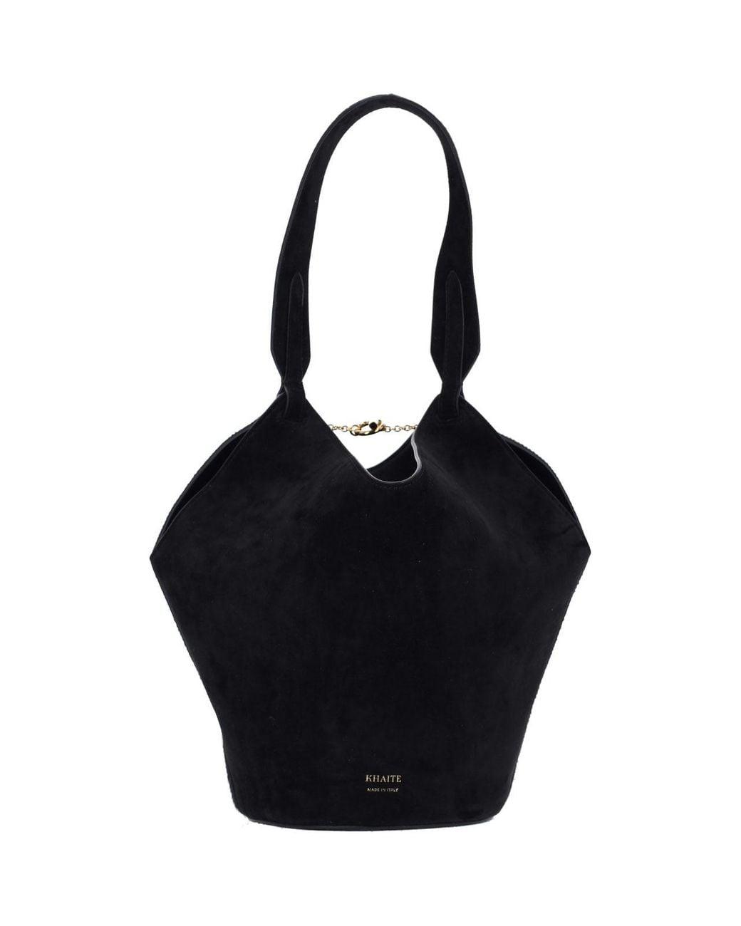 Khaite small Lotus bag in black calf leather on the front, animal print pattern on the back, top handle, gold metal chain and hook closure, gold logo embossed on the front, and single main inner compartment. Composition: 100% Calf Leather Colour: black
