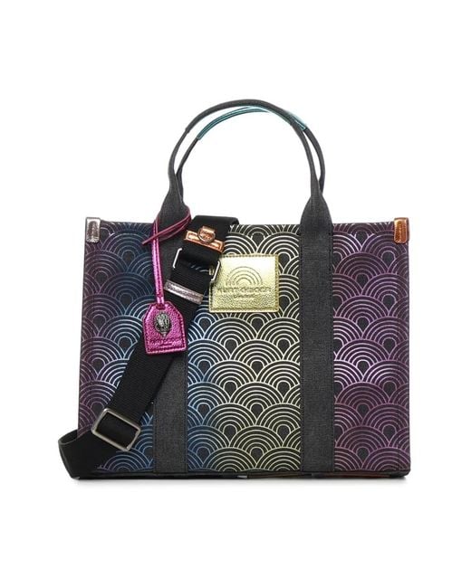 Kurt Geiger Southbank Tote Bag is a printed canvas tote designed for everyday carry. It combines a roomy main compartment with multiple internal pockets and an adjustable, removable strap for versatile wear. Key attributes: Multicolour | Black | Canvas | Zip closure | Internal pocket(s) | Adjustable and removable shoulder/crossbody strap | Two side poppers to extend width | Printed floral pattern | Embossed logo on front | Top handles with chain and scarf detail | Metallic Love tag detail | Dimensions & fit: 34 x 26 x 14 cm | Composition & care: Canvas Colour: purple