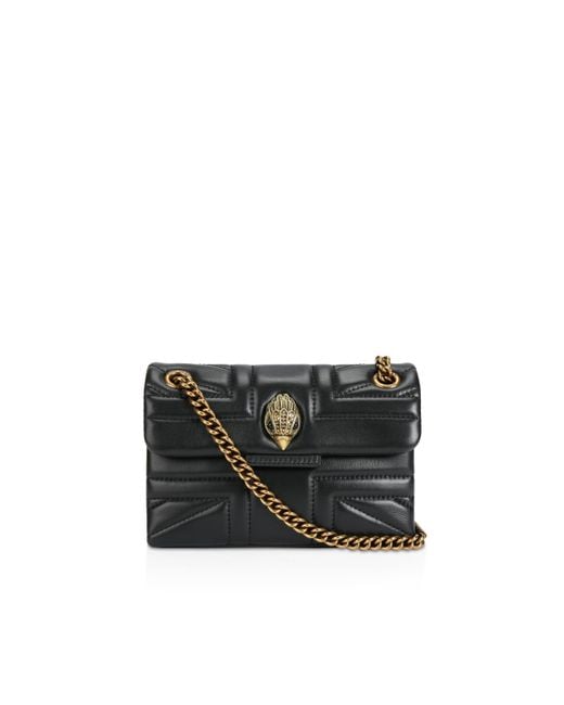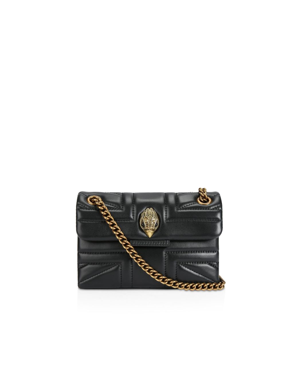 The Kurt Geiger Kensington Union Jack bag is crafted from a soft lambskin leather with stitched Union Jack design. The antiqued brass eagle head features crystals on the front flap. 14cm (H), 20cm (L), 6cm (D) Strap drop cross body: 120cm Strap drop shoulder: 70cm Colour: black