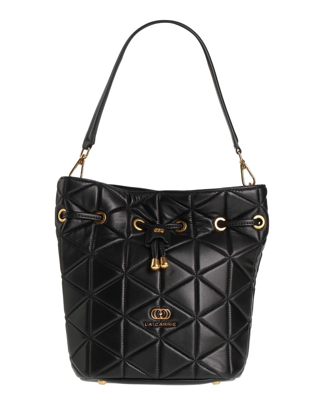 LA CARRIE. bucket bag, leather, quilted, plain colour, brand logo, drawstring fastening, fully lined, bag handle, detachable shoulder strap, medium size, contains non-textile parts of animal origin. Leather. Colour: black
