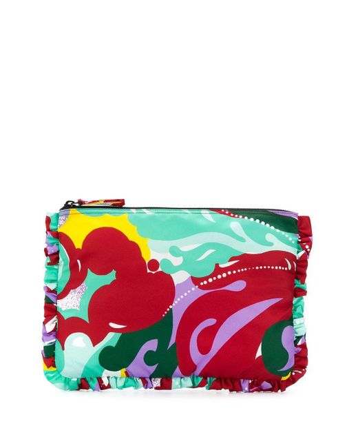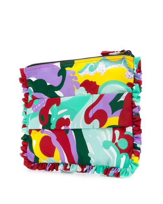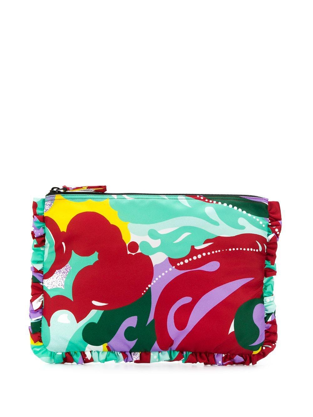 Multicoloured oversized zip pouch from La Doublej featuring a top zip closure, a frill trim and a digital print. Colour: green