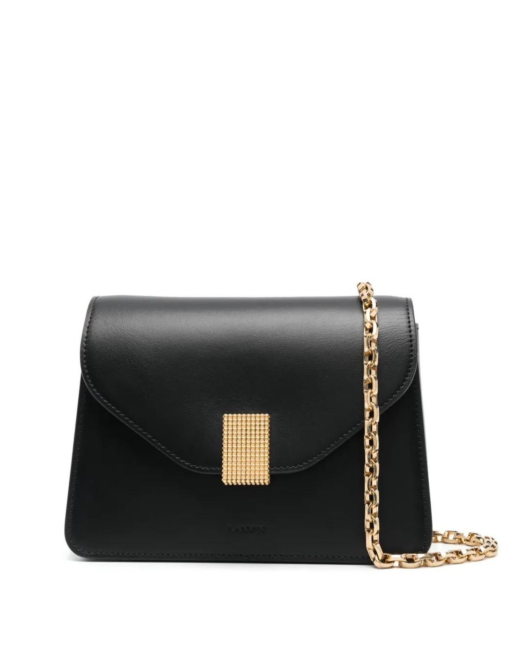Black calf leather smooth grain gold-tone hardware debossed logo to the front foldover top with magnetic fastening detachable chain-link shoulder strap slip pocket to the rear partitioned compartment internal slip pocket Size: One Size. Gender: Female. Material:Lambskin/zamac/Calf Leather/Cotton.