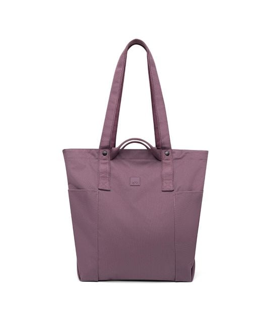 This shopper style tote is a lightweight bag that is perfect to carry your essentials everywhere with a distinctive and minimal design. It features a snap closure, a quick access pocket and a large Thirteen litres, interior main compartment with an inner flat pocket. Lightweight cotton handles. Its Oxford rpet fabric makes it lightweight, water resistant and vegan. Wash cold. Air dry. Colour: purple