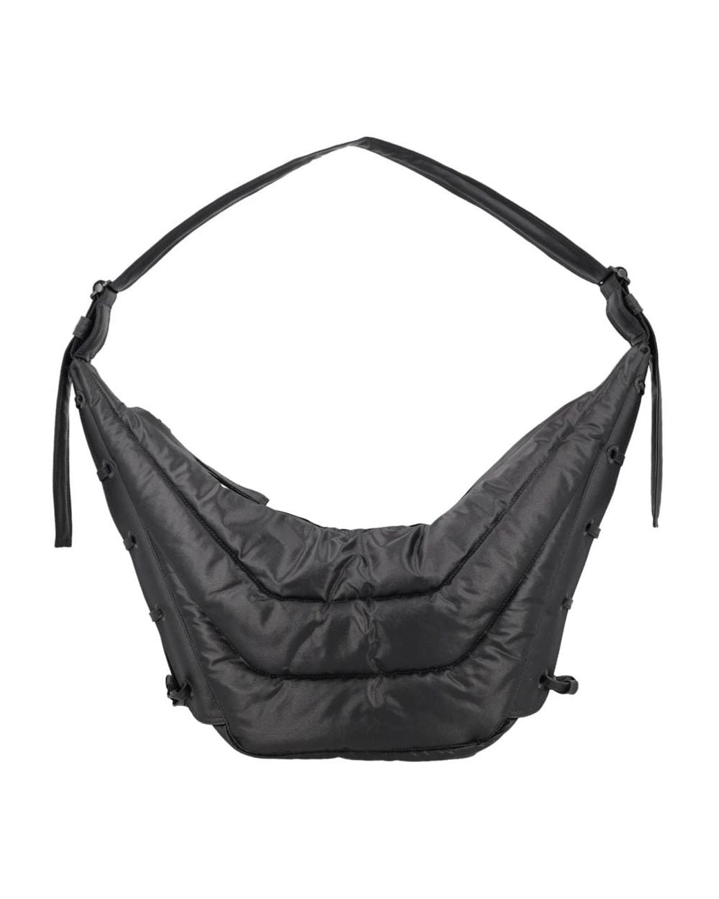 Lemaire Medium Soft Game Bag is a padded shoulder bag designed for everyday carry. Its slouchy, water-repellent canvas construction and adjustable strap make it practical for commuting and travel. Key attributes: Black | Nylon canvas | Water-repellent finish | Adjustable padded shoulder strap | Top zip closure | Interior zip pocket | Lace-up sides | Eyelet and lace detailing | Padded silhouette | Dimensions & fit: Width: 54 cm | Height: 20 cm | One size | Composition & care: Nylon canvas Colour: black