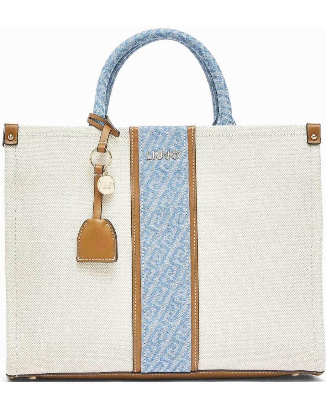 Structured tote bag in off-white canvas with a central vertical stripe in light blue jacquard monogram fabric, framed by tan leather trim. Dual rolled top handles in light blue monogram jacquard with tan leather connector straps. Removable tan leather-trimmed shoulder strap visible at back. Gold-tone metal logo lettering LIUJO applied on the central stripe. Tan leather keychain charm with gold-tone ring and circular branded medallion attached to the handle. Riveted corner reinforcements in gold-tone metal. Visible top-stitching throughout. Colour: white