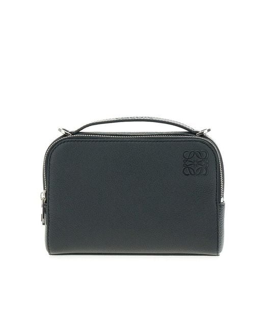 Bag made from grained leather with debossed Anagram on front, featuring detachable and adjustable webbing shoulder strap with jacquard logo. Flat handle with debossed logo. Two compartments with zip closure and canvas lining. Silver-finished metalware. Colour: black