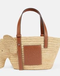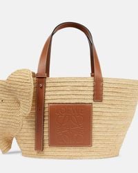 Go to FashdesBasket bag in woven palm leaf and brown calfskin leather. It features two fixed, adjustable leather top handles, a brown leather appliqué with embossed loewe anagram motif, and a single internal compartment. Dust
