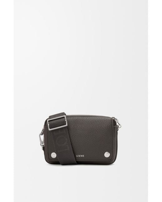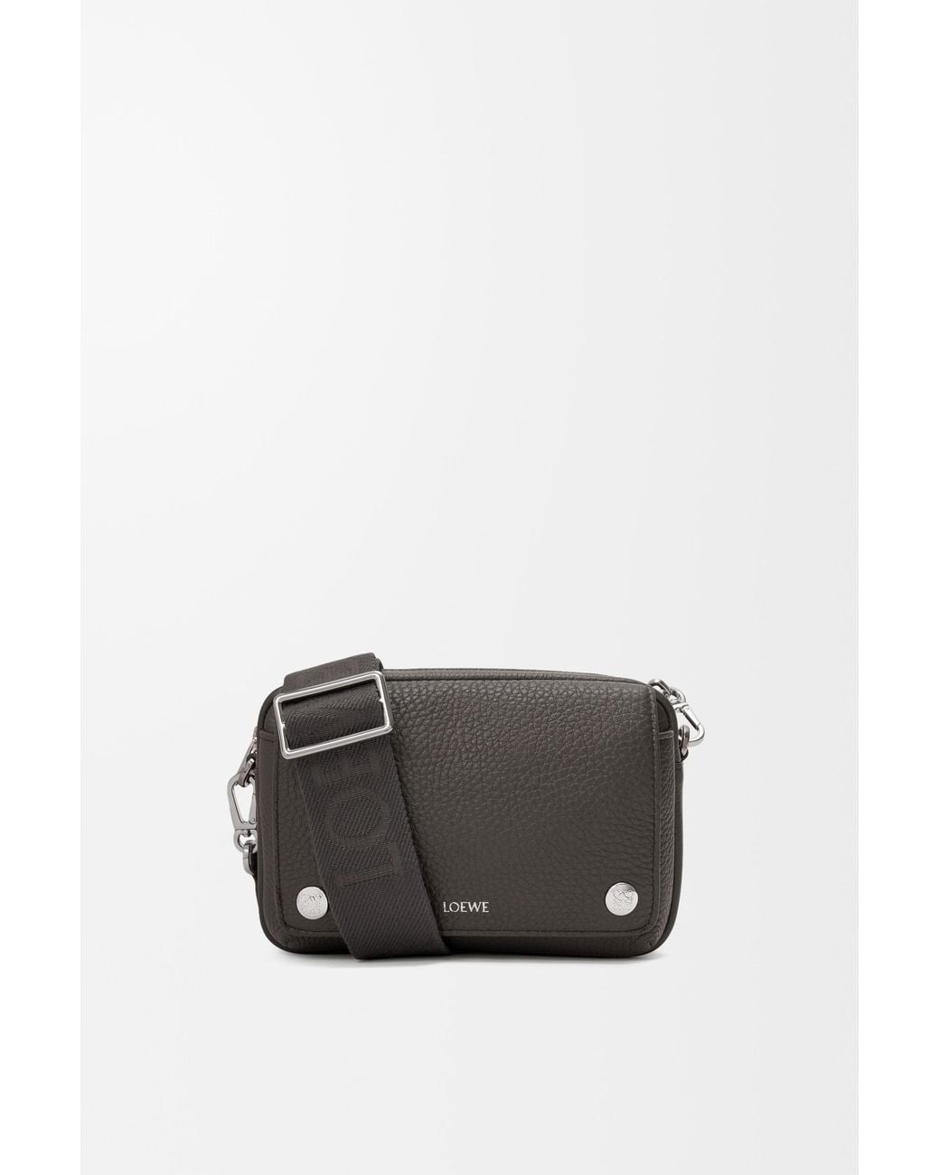 The Pebble messenger is a functional and compact design featuring a double signature Anagram Pebble. This small version is crafted in supple grained calfskin. *Detachable and adjustable LOEWE webbing strap *Zip closure *One front pocket with magnetic closure, one internal slip pocket *Suede lining *Silver embossed LOEWE, Anagram Pebble Colour: black