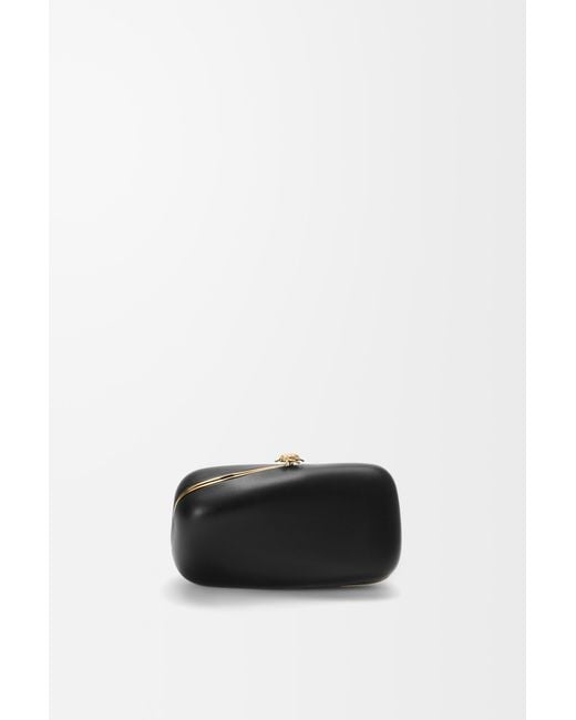 The Twisted Minaudiere is a sculptural clutch whose distinctive shape is given by a twisted 3D print shell, manually covered in leather and underlined by a distorted metal frame. The hammered metal beetle-shaped clasp echoes back to the rest of the collection. This version is crafted in nappa lambskin. *Hand, shoulder or crossbody carry *Detachable and adjustable leather knot strap *Clasp closure Colour: black