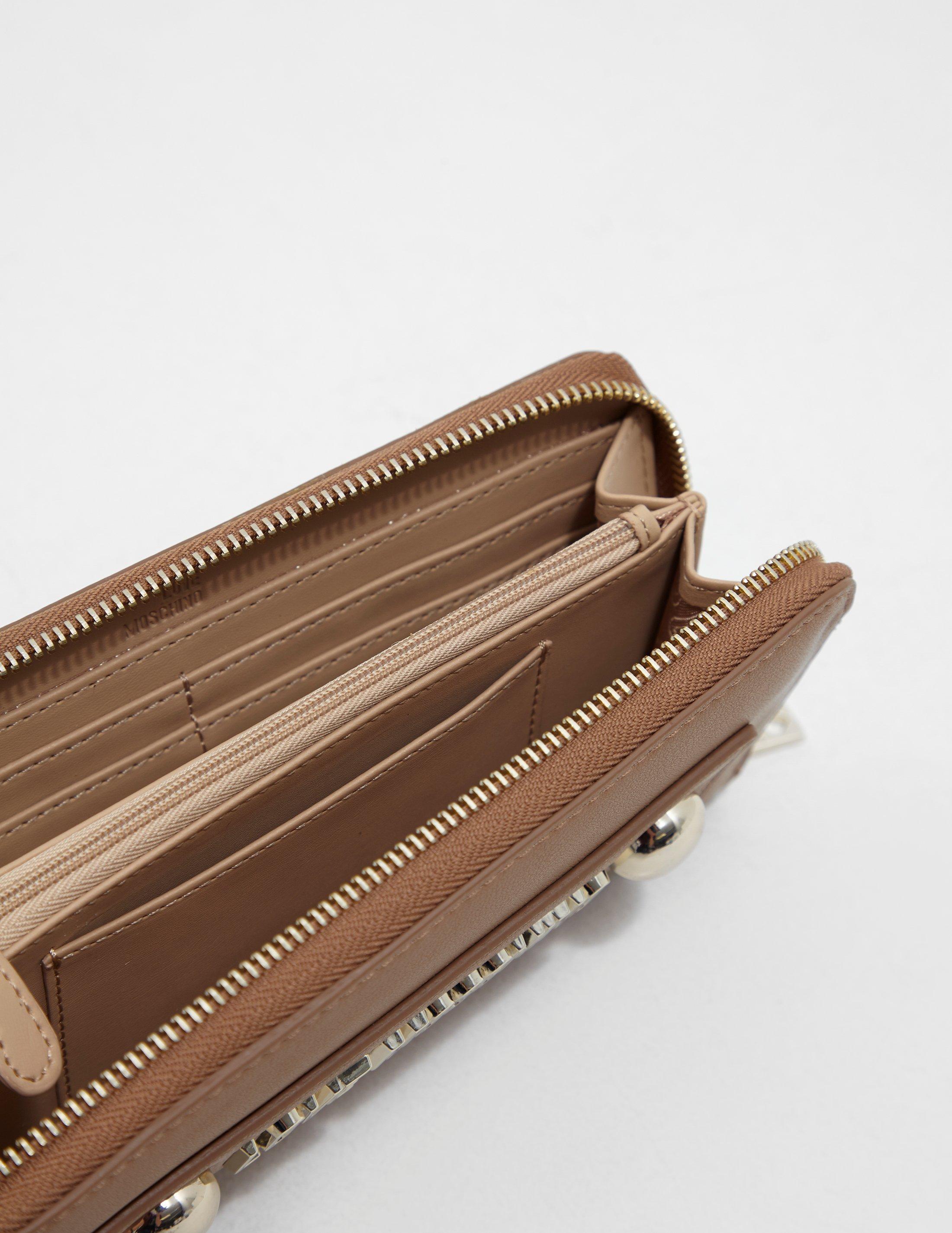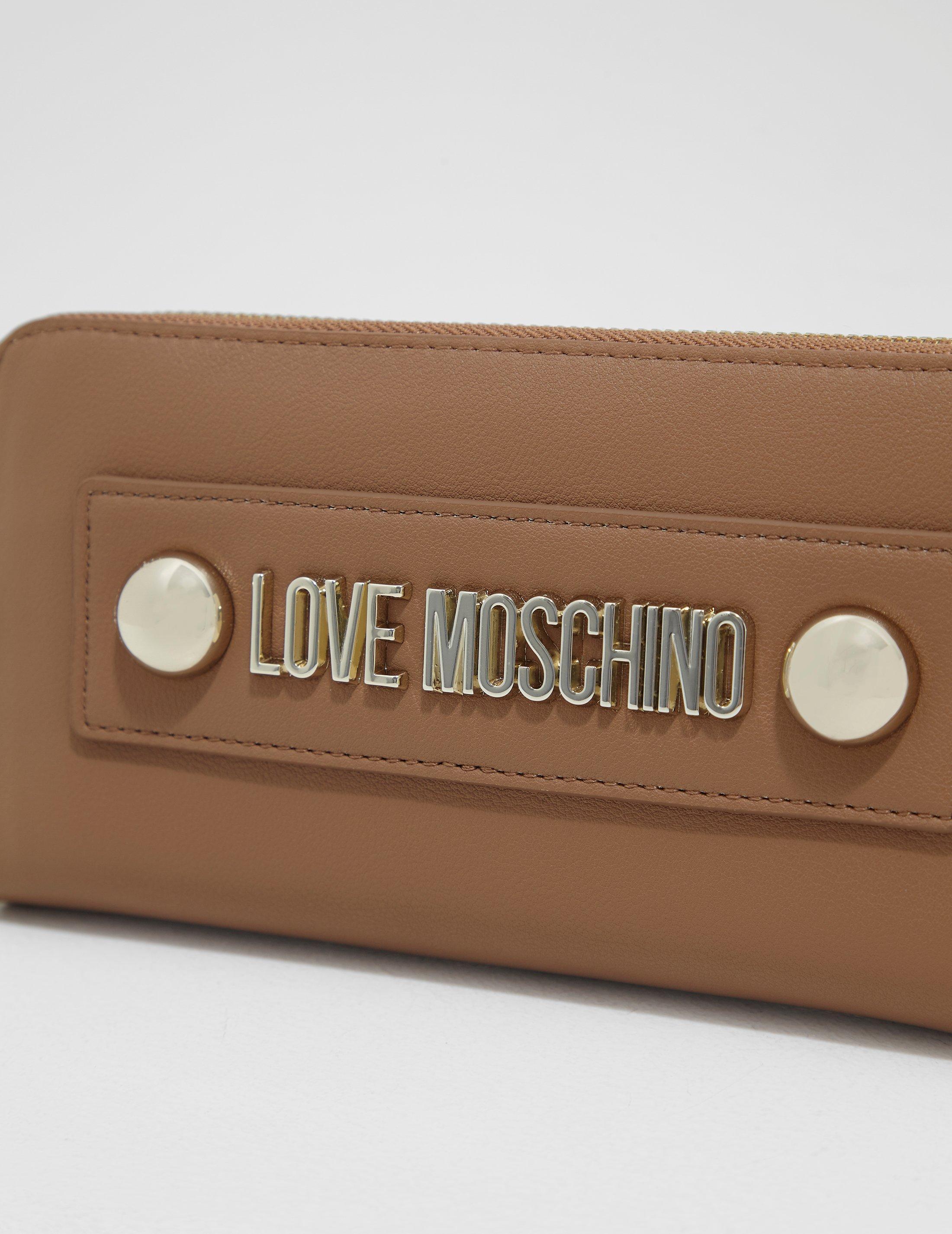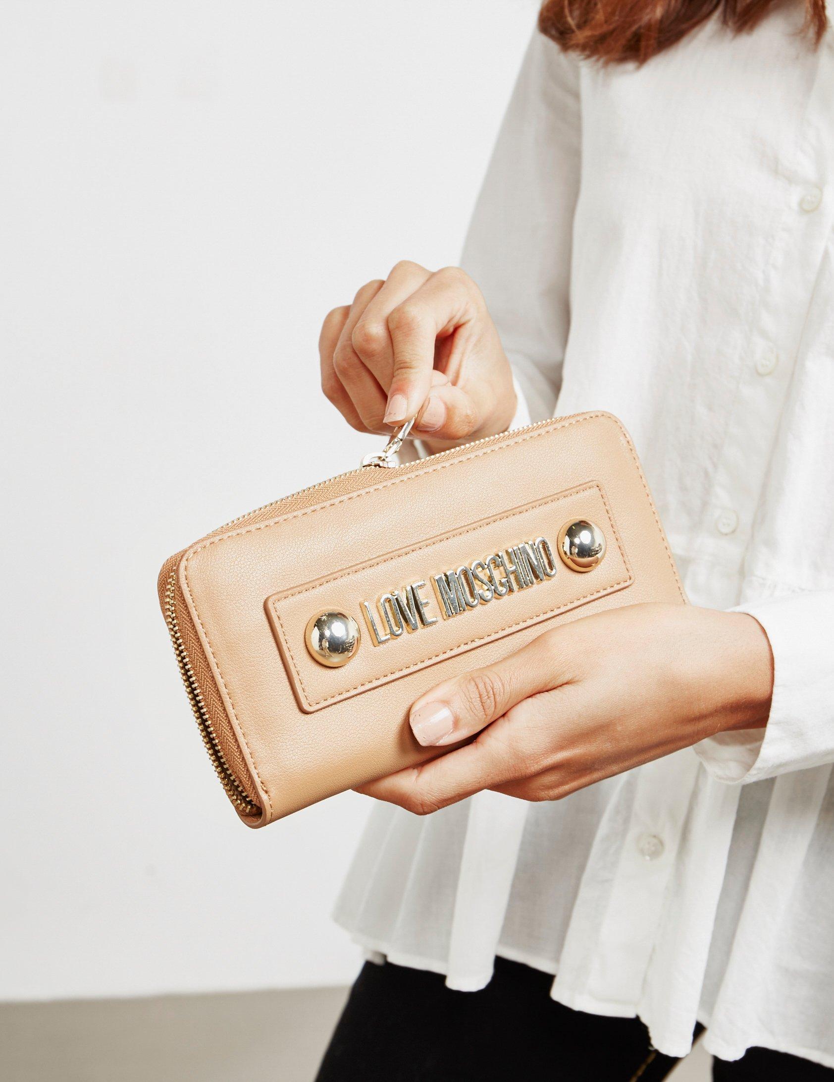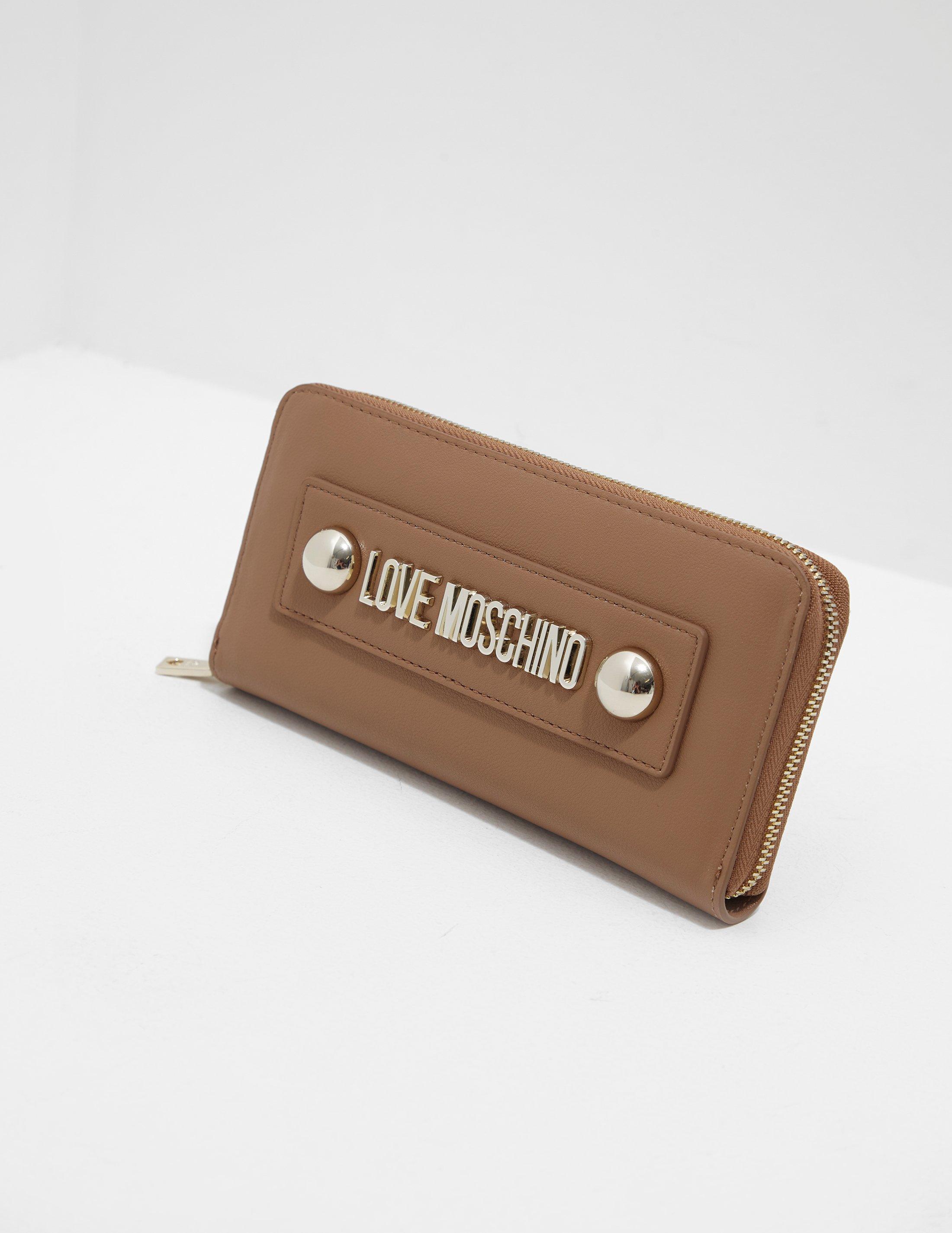 Go to Tessuti UKWith youthful style and stand out fashion in mind, love moschino bring collections that feature simple style whilst keeping your wardrobe up to date and looking as brand new as ever. They present this stud logo purse which comes in a brown colourway and features gold studs. Details; brown colourway, synthetic leather construction, zip around fasten, interior card, coin and note slots, tonal stitching, storage box and gold studs with branding to the front to complete. Dimensions; 19.5cm x 10cm x 2cm.