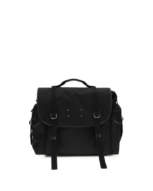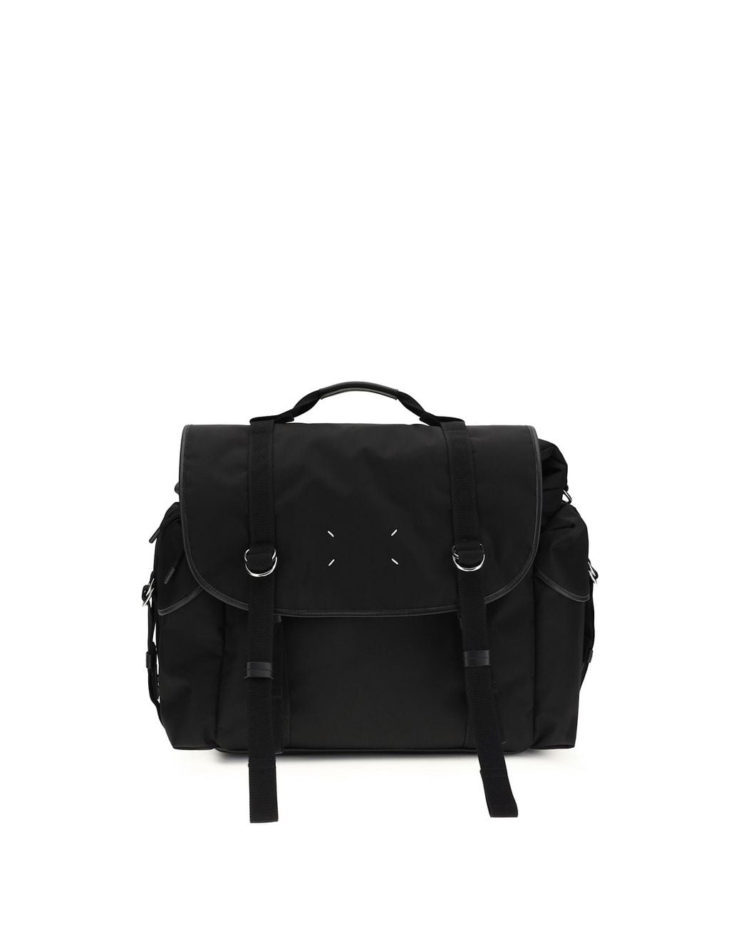 The high tech messenger bag by margiela is a functional accessory with an urban, contemporary design. made from durable nylon, it features a flap closure and straps with metal buckles that define its technical style. equipped with an adjustable shoulder strap and top handle, it offers maximum versatility of use. the model includes double side compartments, a zippered mesh compartment on the back, and a flat internal pocket for practical organization. iconic details, such as the logo lettering plaque on the back and the four stitches logo on the front, complete the bag with the maison's unmistakable signature. Composition: 100% % Calf Leather Bos Taurus Colour: black