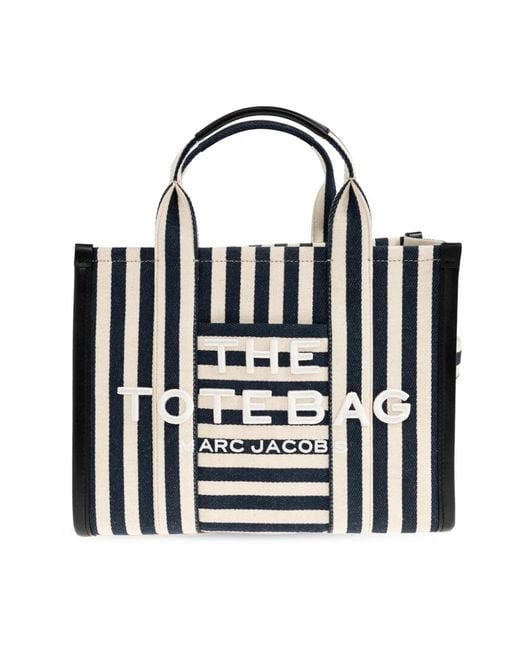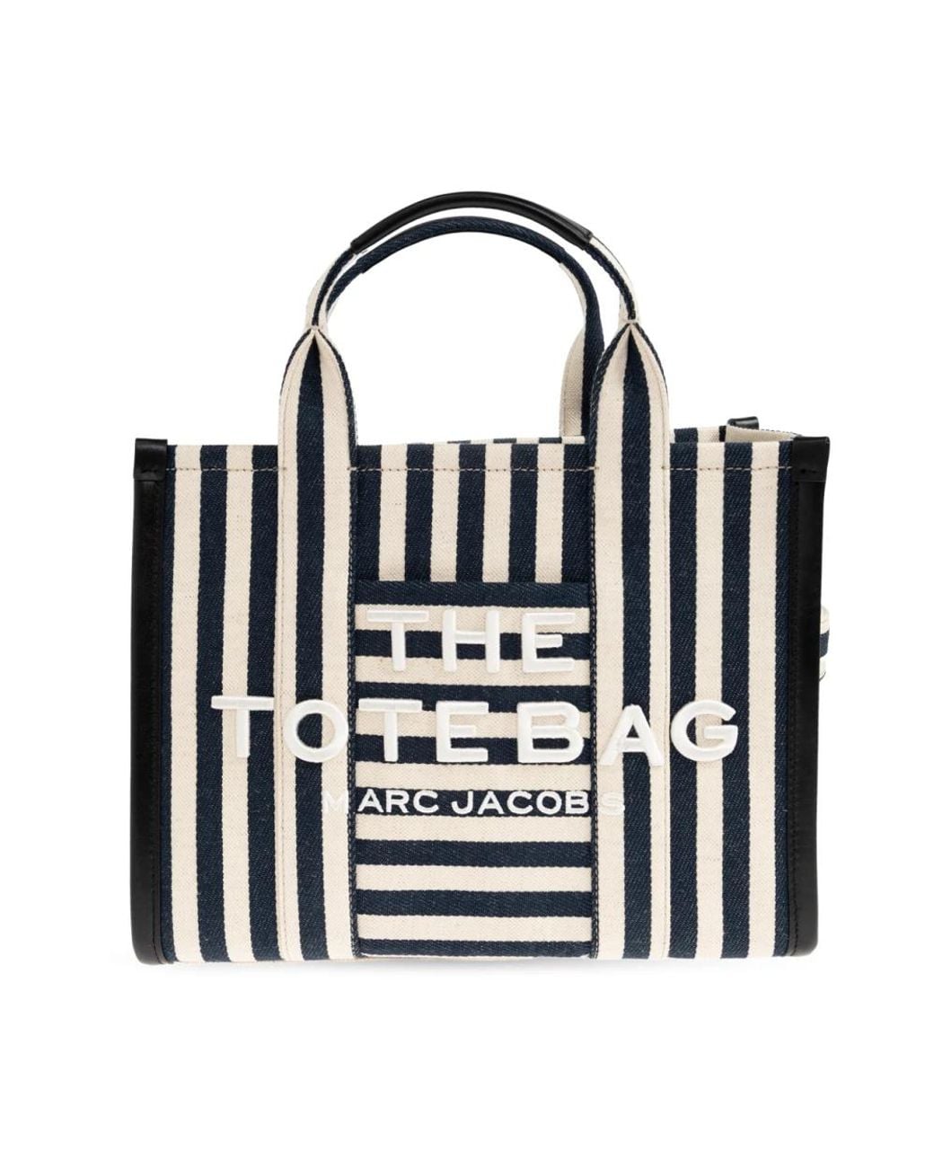 Marc Jacobs The Tote Bag is a structured shopper that pairs reinforced canvas construction with bold striped detailing for everyday use. Its rectangular silhouette and zippered interior pocket offer organised, practical carrying. Key attributes: Blue | Navy blue | Canvas | Zippered interior pocket | Double, wide top handles | Reinforced sides | Rectangular silhouette | Vertical navy and white stripes | Contrasting horizontal exterior pocket pattern | Raised "The Tote Bag" inscription | Subtle brand mark | Dimensions & fit: Height: 26cm | Width at widest point: 37cm | Bottom width: 14cm | Model measurements - Height: 176cm, Bust: 85cm, Waist: 60cm, Hips: 89cm | Composition & care: Linen | Rayon | Cotton Colour: black