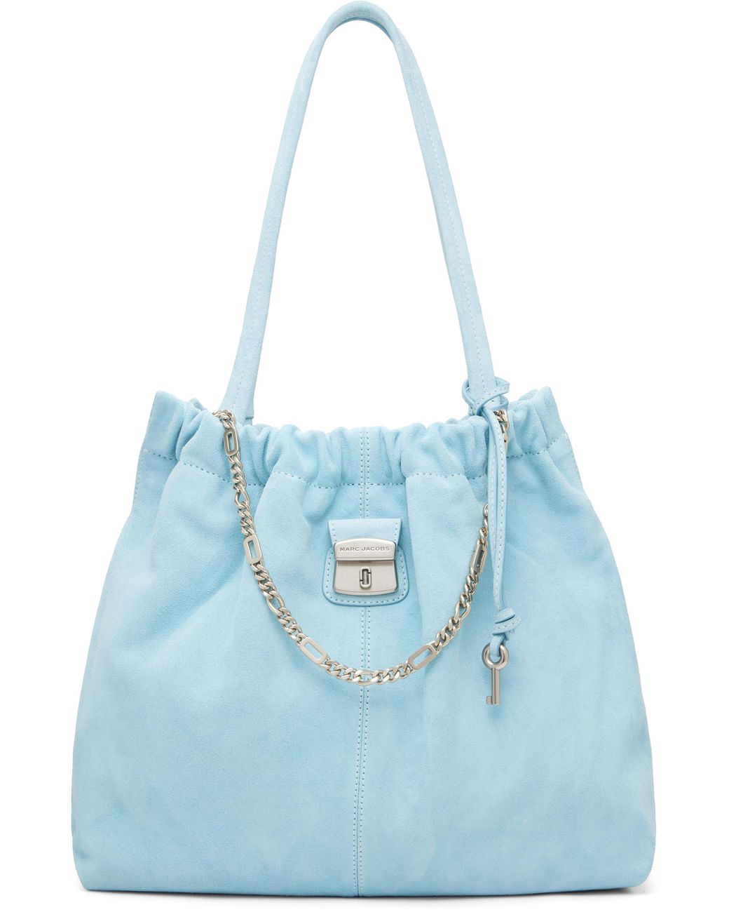 Italian suede tote. · Twin rolled carry handles with key charm-on-lanyard · Logo hardware at face · Curb chain detailing with logo hardware at elasticized throat · Magnetic closure · Zip pocket at interior · Faille lining · H12 x W14 x D5 Part of THE™ collection. Supplier color: Blue Mist Colour: blue