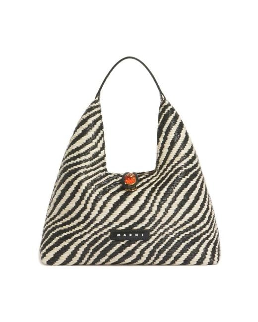 Marni Tote Small is a compact woven shoulder tote defined by a zebra-inspired pattern and a visible logo patch, designed for stylish everyday carry. Key attributes: Black | Nero | Woven fabric | Top handle | Shoulder strap | Interior zip pocket | Zebra pattern | Logo patch | Woven texture | Composition & care: Woven fabric | Cotton lining Colour: grey
