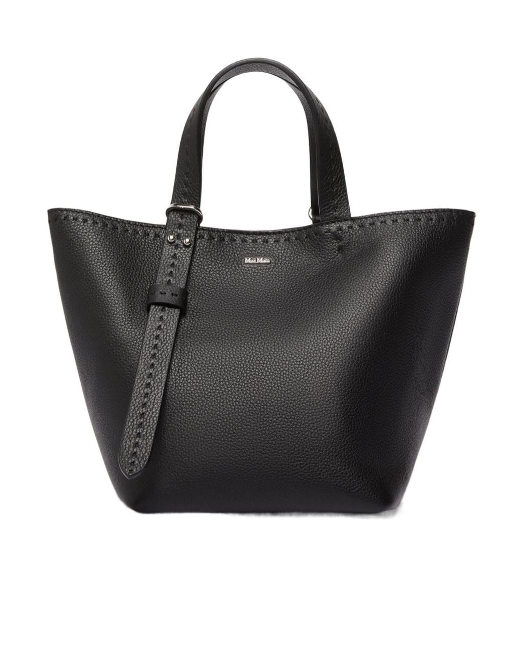 Decorated with custom stitching, metal Max Mara logo on the front, loop to secure small leather goods, detachable shoulder strap, small patch pocket inside, base with metal feet, magnetic closure. Colour: black