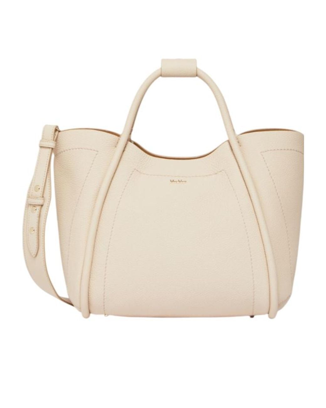 Featuring stitched detailing, a soft lining, zippered and slip pockets, tubular handles secured with snap-button bracelets, a detachable shoulder strap that attaches to interior D-rings, the Max Mara logo on the front, and five protective metal feet, with a magnetic snap closure at the top. Colour: natural