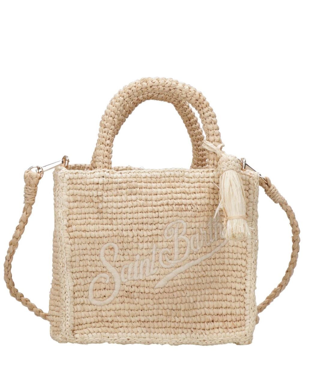 - Raffia - Woven motif - Rigid handles - Removable shoulder strap - Dangling tassel on the side - Embroidered front logo - Inside pocket with logo - Dimensions: W 18cm H 16cm D 7cm Colour: metallic