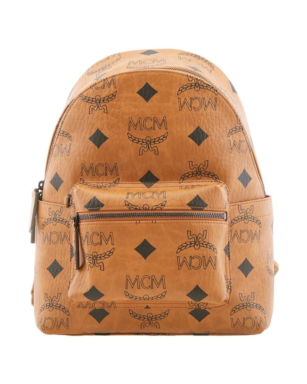 MCM Mens Backpack. SKU: MMKESVE01CO. Color: Cognac. Size: 5.5 x 11.0 x 13.6. MCM Maxi Visetos Stark Backpack. This backpack features a leather top handle, adjustable shoulder straps ranging from 75 cm to 89 cm in length, a zip closure, a front zip pocket, a spacious main compartment, two water bottle holders, a laptop slit, a padded back panel, matte black metal hardware, and a microfiber lining with a suede finish. Colour: brown