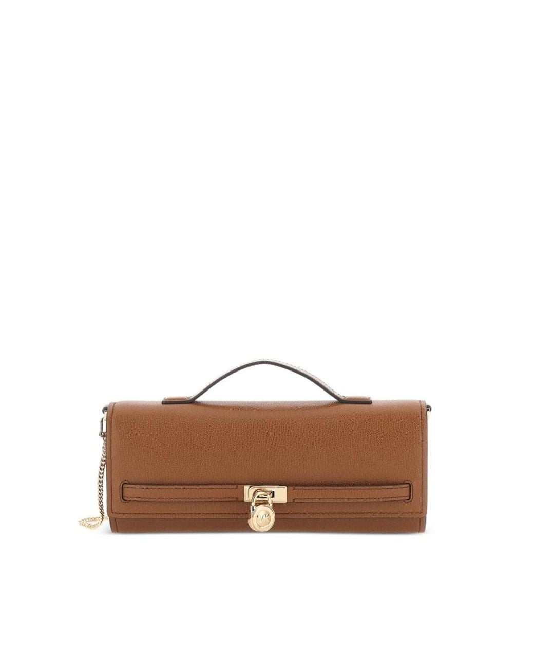 Michael Kors Padlock Top-Handle Shoulder Bag features a grained texture and a signature padlock accent, designed for versatile carry with a single top handle and a chain shoulder strap. Key attributes: Brown | Luggage | Single top handle | Chain shoulder strap | Padlock detail | Grained texture | Padlock accent | Single top-handle silhouette