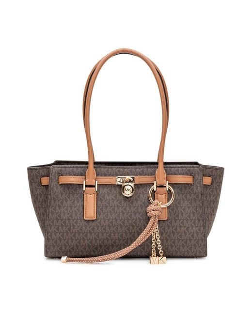 Michael Kors Hamilton Moderne Small Signature Logo Satchel is a structured shoulder satchel in the brand's signature logo print. Its compact, organized interior and extra-long shoulder straps make it a practical choice for everyday and smart-casual use. Key attributes: Brown | Acorn | Coated canvas | Zip fastening | Front and back slip pockets | Interior slip pockets | Extra-long shoulder straps | Decorative bag charm | Signature logo print | Belted trim with chain-link pendant | Structured silhouette | Rectangular shape | Side gussets | Dimensions & fit: 15.35x 7.09x 5.51 | 13"W x 7"H x 4.75"D | Composition & care: Outer: 89.4% coated canvas, 9.6% polyester, 1% polyurethane | Trim: 75% polyurethane, 25% polyester | Lining: 100% polyester Colour: brown