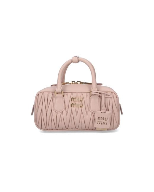 Miu Miu 'Arcadie' pink nappa leather handbag with two handles, removable mirror charm detail, adjustable and removable shoulder strap, double zip closure, gold metal logo on the front, inner zip pocket and main inner compartment. - Trims: 100% metal