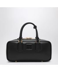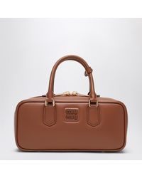 Go to TheDoubleFLarge Tundra leather bag by Miu Miu, featuring two handles with strap detail, adjustable and removable shoulder strap, double zip closure, embossed logo lettering on the front, internal zip pocket, and metallic elements with gold finish. Colour: brown