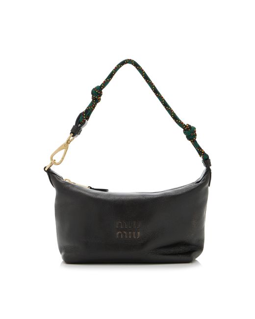 Miu Miu has served as Miuccia Prada's outlet to showcase her more playful side; without compromising elegance or style.This pouch has a hobo silhouette made from antiqued leather with a rope wristlet. Colour: black