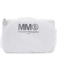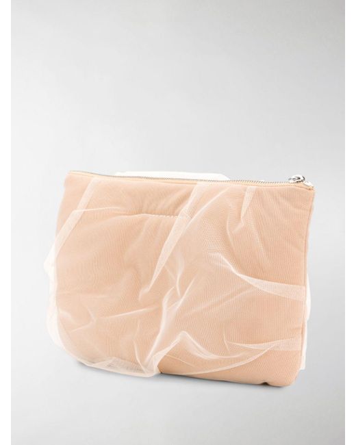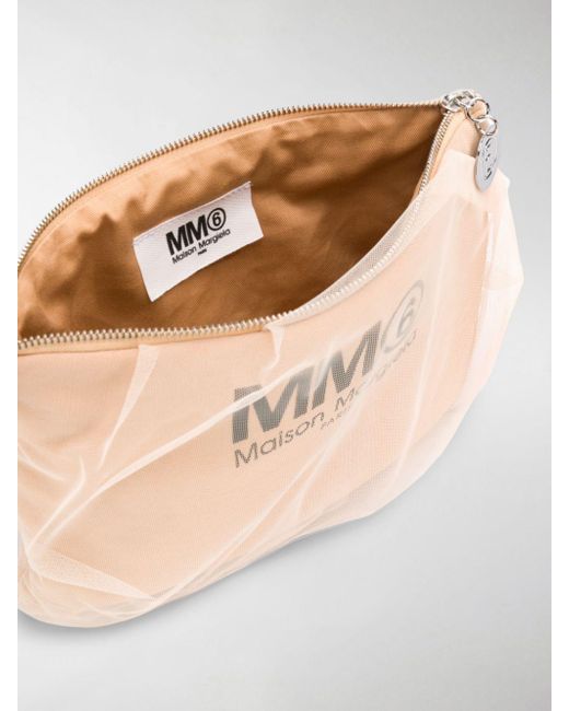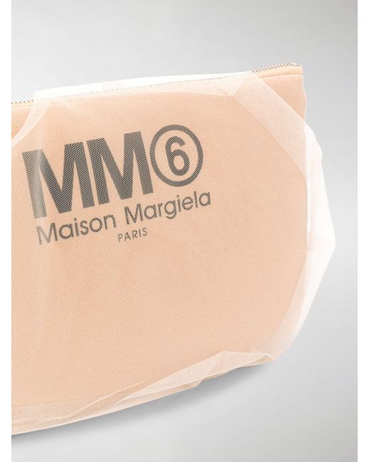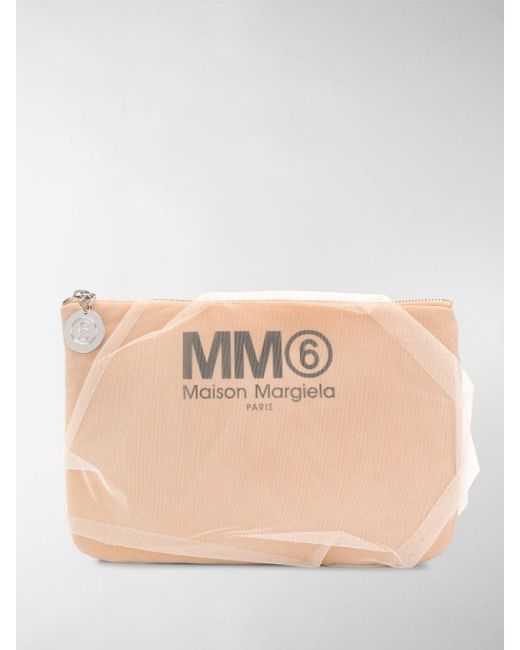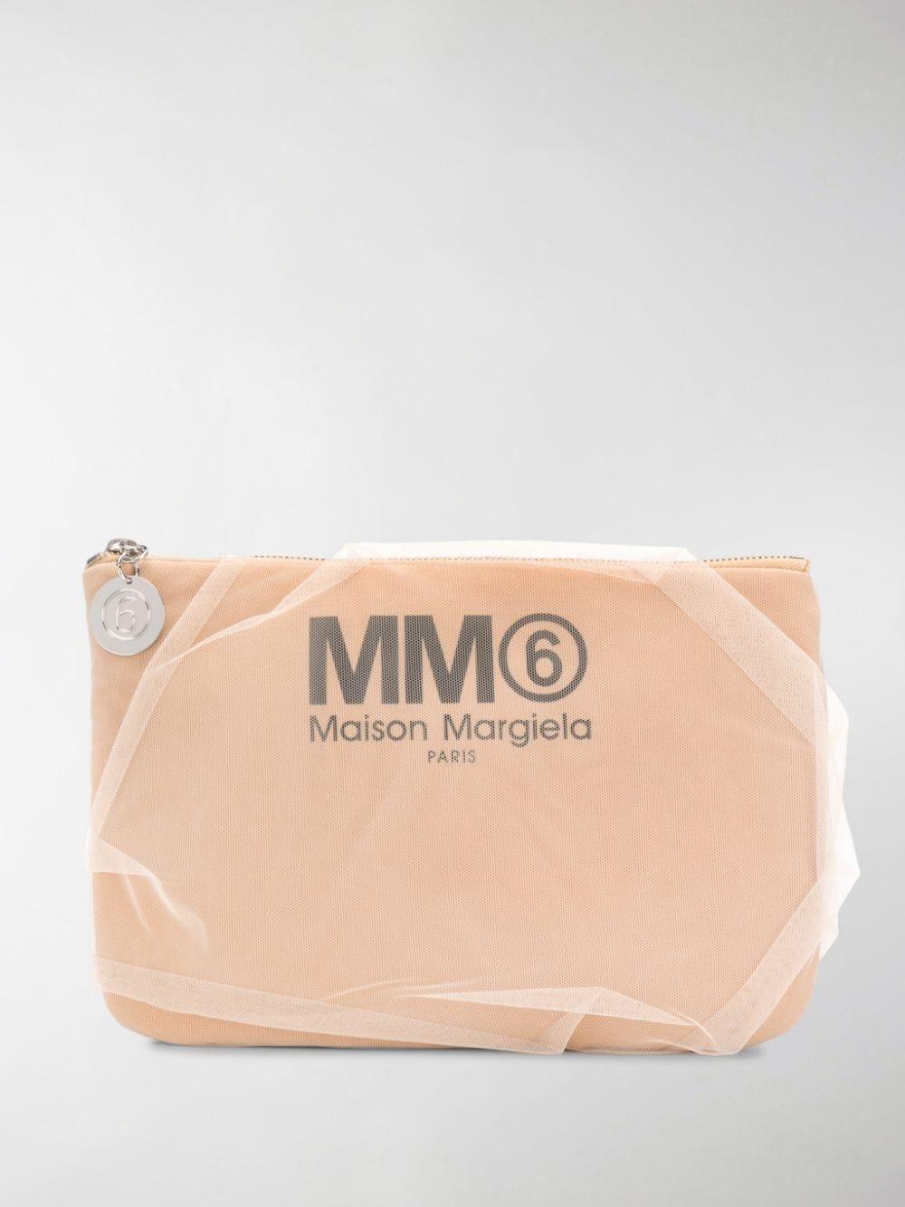 With branding being such a major trend in streetwear and on the runway, MM6 presents a selection of ready-to-wear and accessories detailed with the iconic MM6 copyright logo, as showcased in this light beige tulle clutch bag from MM6 Maison Margiela. Featuring a top zip fastening, an internal logo tag and a printed logo to the front. Colour: multicolour