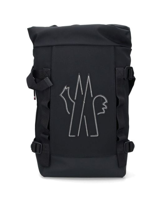 Moncler Grenoble 'Ski' backpack in black fabric with top handle, adjustable shoulder straps, zip transcist detail, drawstring closure, contrast logo embroidery at the front, four adjustable side buckles, two side pockets, one back zip pocket, logo zipper detail, one inner zip pocket, one main inner compartment. Colour: black