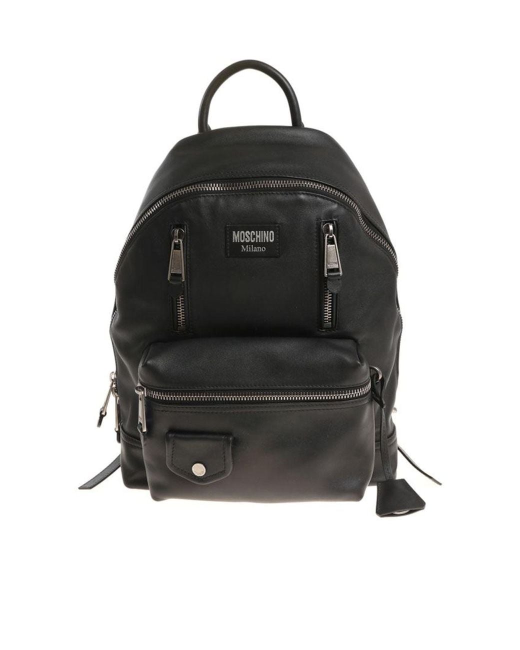 Leather backpack featuring front logo detail, removable charm, front zip pocket, front snap pocket, inner slip pockets, one inner zip pocket, adjustable shoulder straps and double slider zip closure. Colour: black