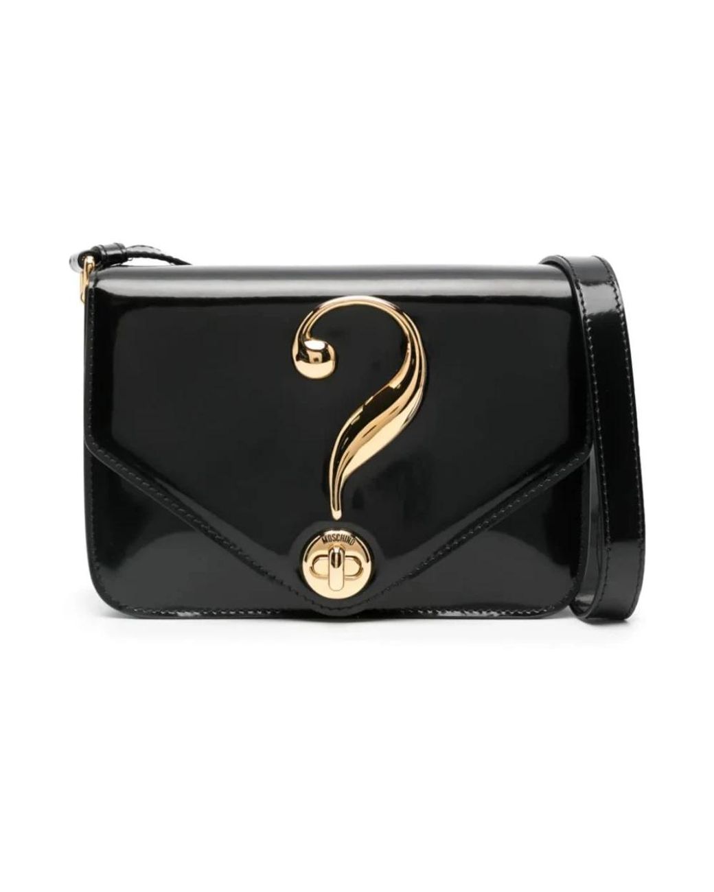 Moschino Patent Leather Crossbody Bag features a distinctive question-mark plaque and a compact, hands-free silhouette. Ideal for everyday use, it pairs a shiny leather finish with practical compartments and gold-tone details. Key attributes: Black | Nero vernice | Leather | Adjustable shoulder strap | Top flap | Turn-lock closure | Single main compartment | Interior zip pocket | Interior logo application | Gold-tone hardware | Question mark plaque | Shiny patent finish | Flap top | Dimensions & fit: Depth: 8 cm | Height: 15 cm | Strap length: 103 cm | Composition & care: Leather | Metal hardware