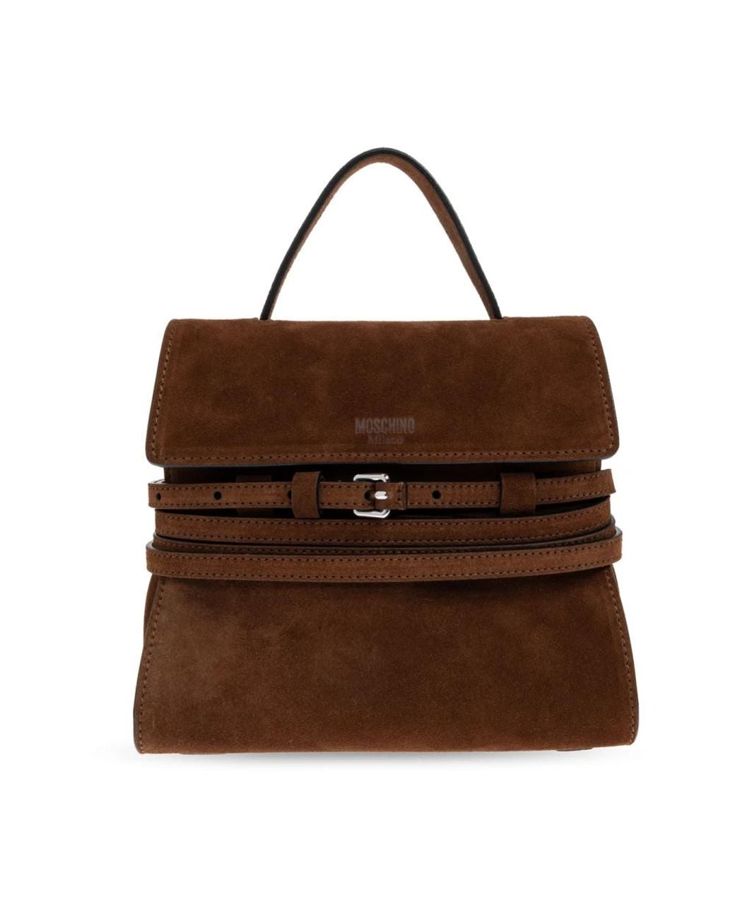 Moschino Suede Leather Handbag pairs a structured trapezoidal silhouette with a decorative suede strap and silver buckle, offering refined everyday carry with a distinctive designer touch. Key attributes: Brown | Suede and leather | Flap closure | Top handle | Adjustable, detachable shoulder strap | Trapezoidal silhouette | Decorative suede strap with silver buckle | Embossed logo on front flap | Smooth suede surface | Dimensions & fit: Height: 18 cm | Width (widest point): 20 cm | Bottom width: 11 cm | Trapezoidal silhouette | Structured shape with wide base that narrows toward the top | Composition & care: Suede | Leather Colour: brown