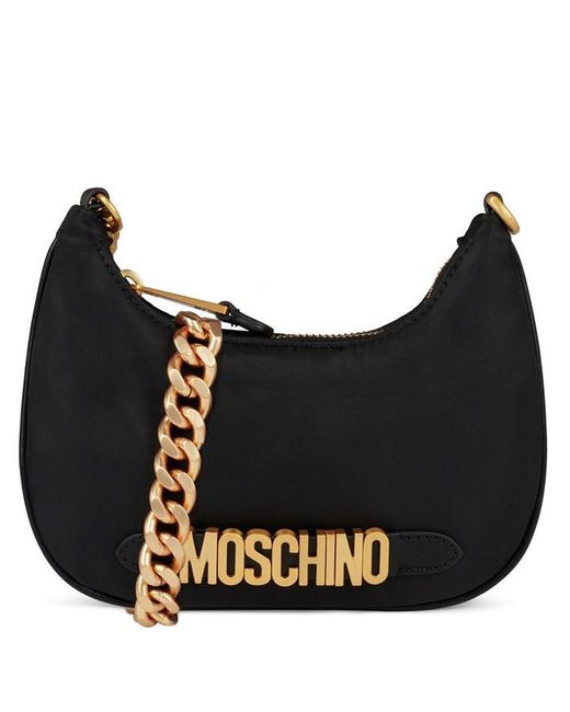 Downsizing a wardrobe staple accessory, the Moschino Mini Nylon Shoulder Bag has been cut in a curved silhouette for an adorable styling piece adding a fun and playful touch to your evening attire. Made from a durable Nylon fabrication boasting a block colour for a statement look, this bag offers a fully lined main compartment secured with a full zip fastening to the upper. Branded with a designer plaque adorned to the front made from gold-toned hardware for a luxe appeal, this bag can be carried with the detachable gold tone chain strap. H 13cm x W 19cm x D 1cm. Colour: black