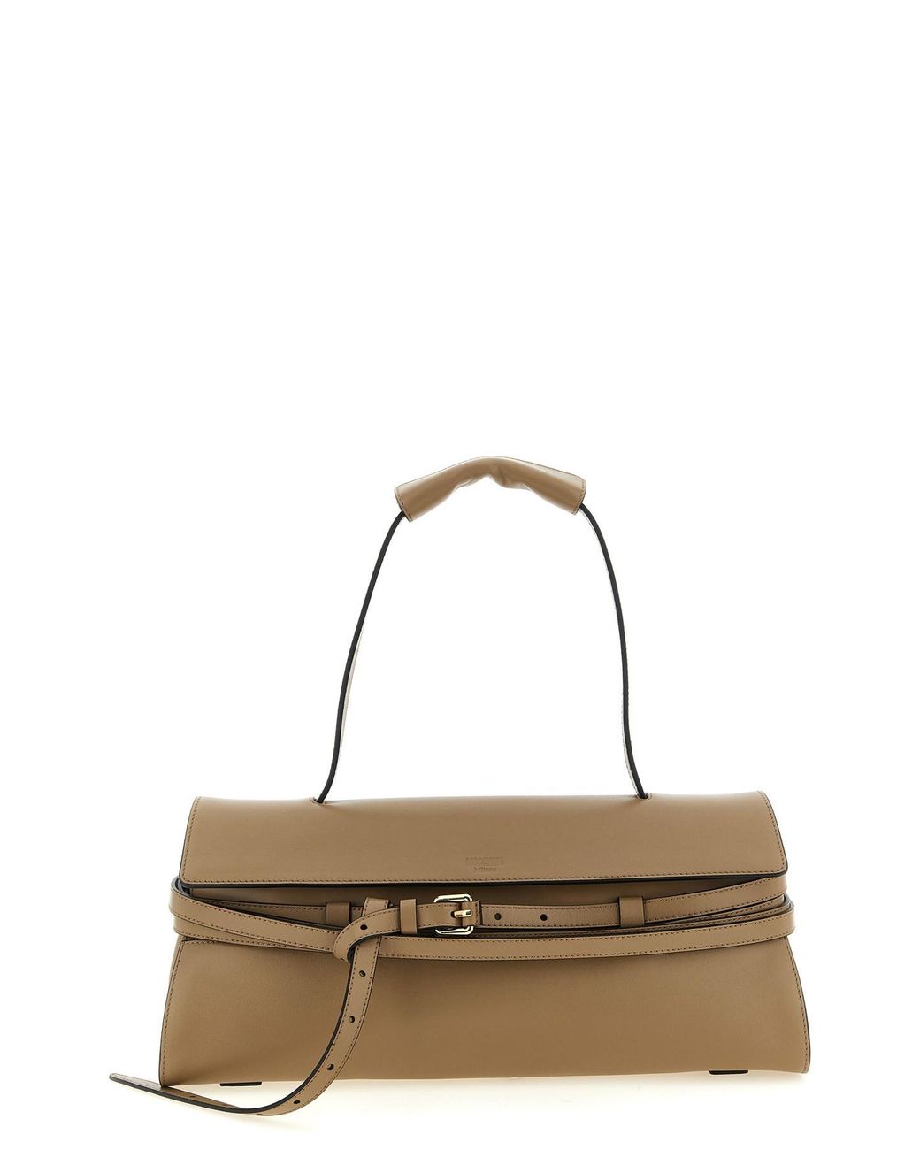Tie Me' leather shoulder bag with front belt detail, front embossed logo, fixed handle, magnetic flap closure. Adjustable and removable leather shoulder strap. Composition: 100% nappa leather. Size&Fit: W 40.5 x H 18 x D 14 cm. Colour: multicolour