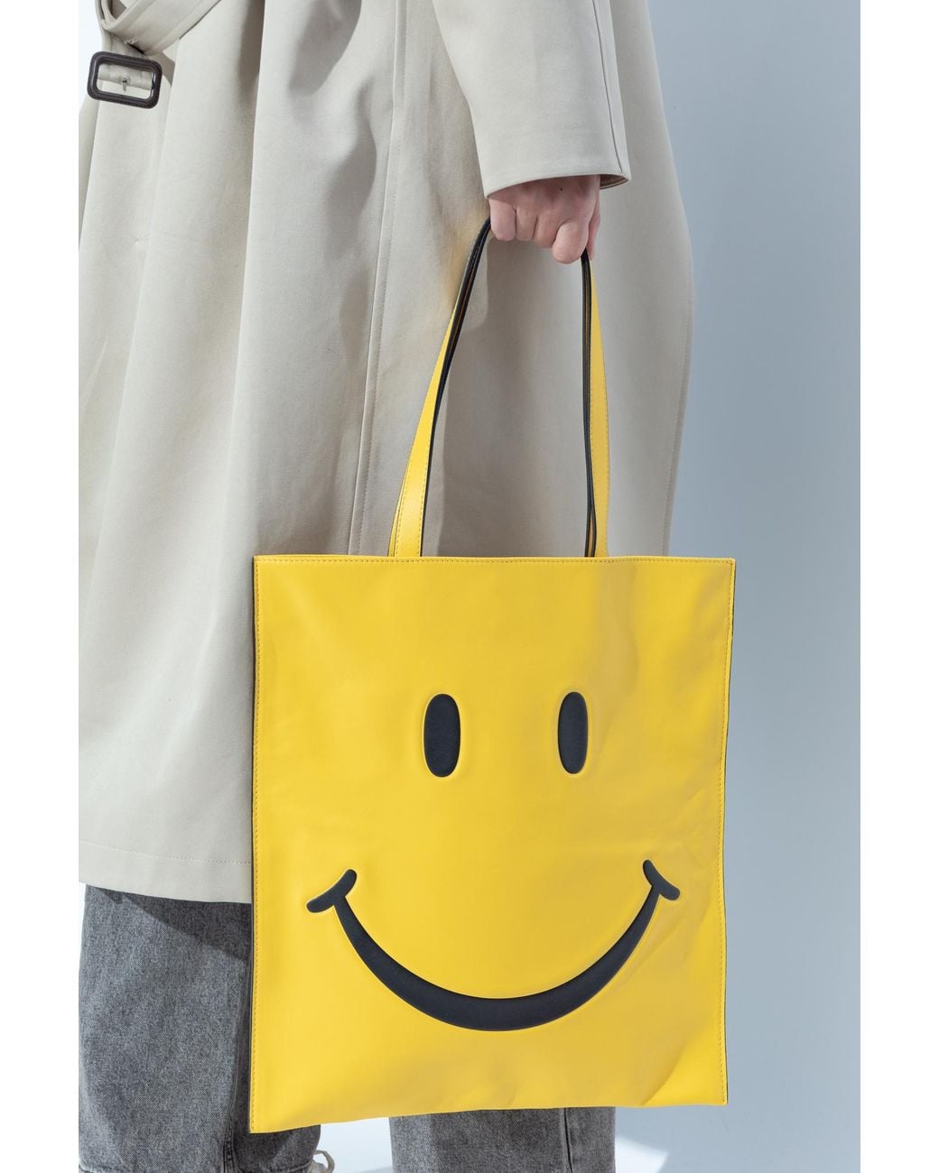 smiling Smiley® emoticon. The rectangular shape of the bag is equipped with long handles that