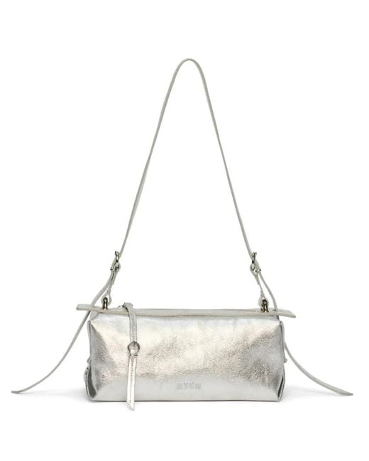 Grey cylinder shape adjustable strap top zip fastening logo charm front logo patch Size: One Size. Gender: Female. Material:Polyurethane. Colour: white