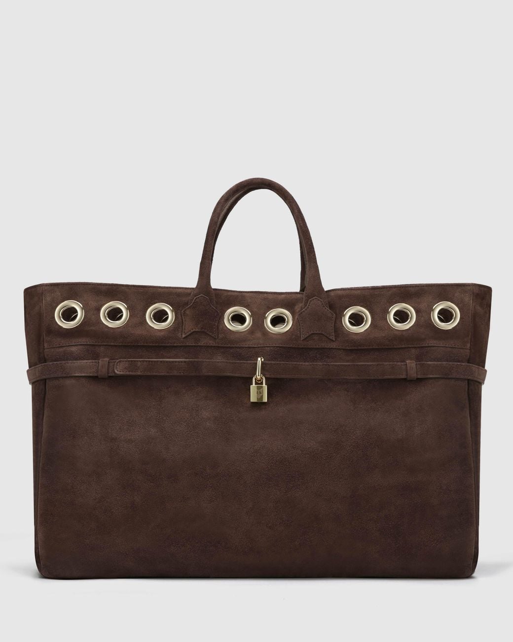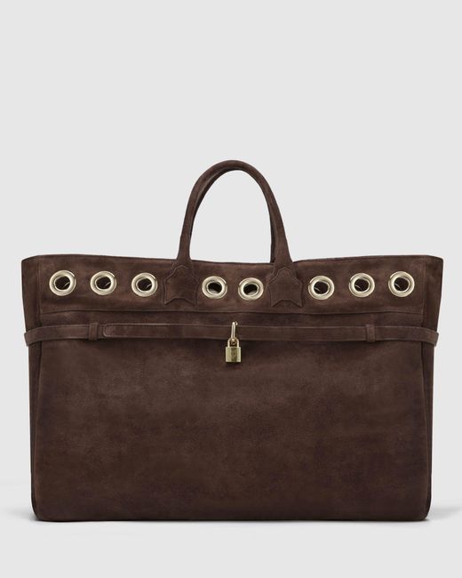 Product Description Meet the Brooklyn Handbag - a true statement of Italian craftsmanship. Handmade in Florence in a second-generation family-owned atelier since 1960, this bag is crafted from luxurious 100% Italian suede. Featuring bold eyelet detailing, a signature padlock front, and Wolfe head branded lining with an embossed suede internal logo and YKK zip pocket, every detail is meticulously considered. Hand-sketched in London and over five months in the making, the Brooklyn is a one-of-a-ki Colour: brown