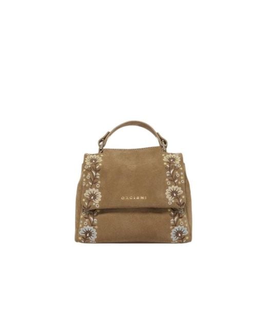 Orciani Sveva Peach Flowers Mini is a compact suede leather mini bag that combines an embroidered floral motif with a practical removable shoulder strap for day-to-evening use. Key attributes: Beige | Biscotto | Suede leather | Removable and adjustable shoulder strap | Internal zip pocket | Flap with internal magnetic closure | Top handle | Embroidered floral detail | Flap with magnetic button | Mini silhouette | Pale gold hardware | Smooth calf leather top handle | Dimensions & fit: Width: 20 cm | Height: 15 cm | Depth: 8 cm | Composition & care: Outside: 100% Calf leather | Inside: 50% Polyamide, 50% Polyurethane Colour: natural