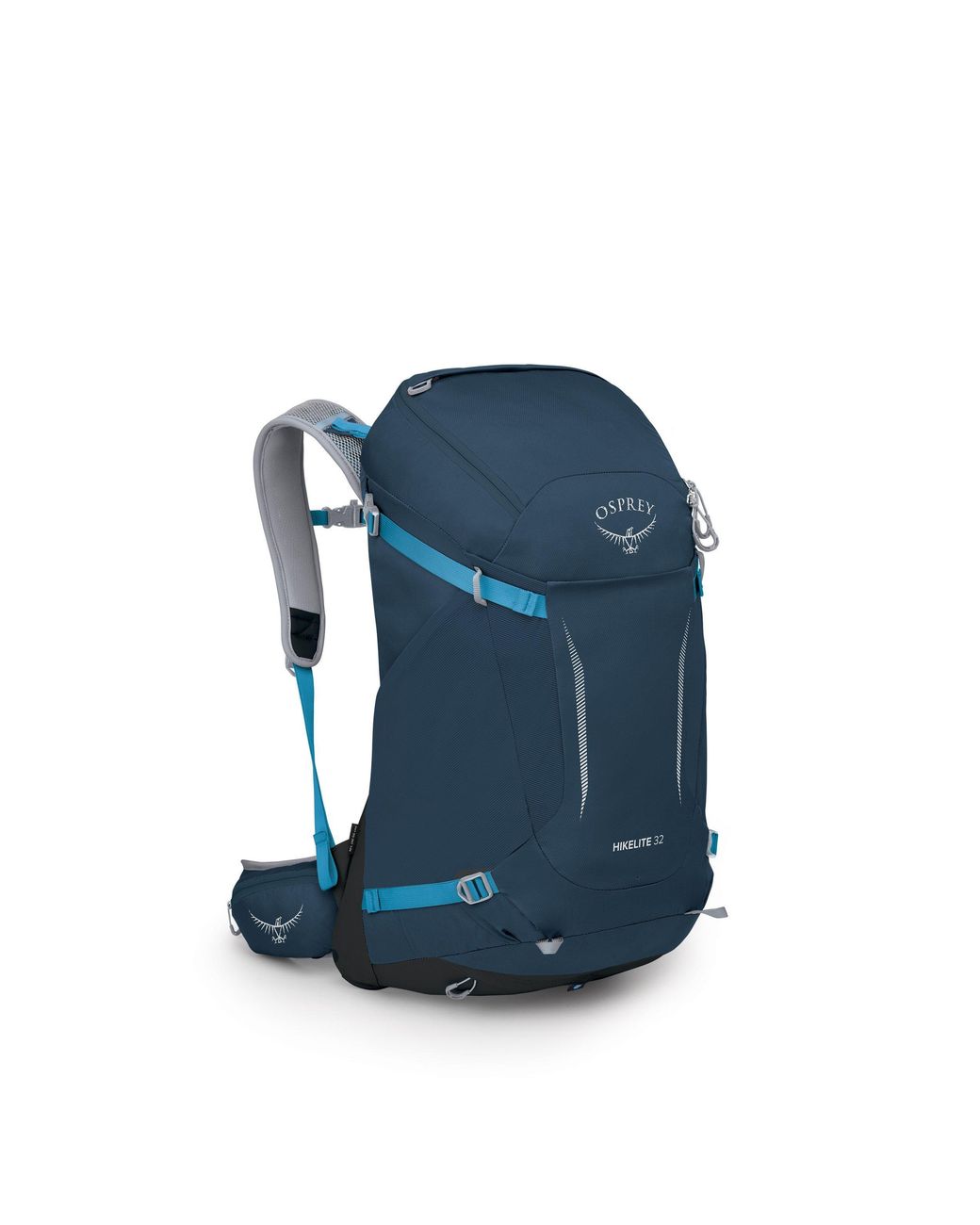 Features * Bucket-style, zip-top main compartment opening * Front fabric shove-it pocket with stretch panels to help manage overloads * Included raincover made with bluesign approved fabrics and DWR treatments made without PFAS, stored in zippered pocket at base of pack * Extra-tall stretch mesh side pockets keep contents secure * External access zip pocket with key clip keeps small, essential items handy * Dual upper side compression straps with trekking pole capture and lower compression straps for additional load control * Dual trekking pole loops * Internal reservoir sleeve with hose port in backpanel and Osprey Hydraclip for easily hanging a reservoir * Adjustable sternum strap with rescue whistle * Padded hipbelt with one zippered pocket and one stretch mesh open pocket WALKING ON AIR. Whether you're a casual or experience hiker, the lightweight and streamlined Hikelite 32-litre combines essential features and quality construction with the impeccable ventilation that AirSpeed has to offer. With a bucket-style main compartment, its stuff-and-go design keeps things simplified on any trail. Sized for all-day hikes with plenty of gear to carry, it comes with padded hipbelt pockets and external organisation to help manage overloads. AirSpeed SUSPENSION A tensioned mesh backpanel keeps the weight off your back, enabling highly ventilated carrying comfort. MINIMALISTIC DESIGN Clean, uncluttered designs are easy to use and understand. RAINCOVER INCLUDED Because rain or shine, there's no excuse to not hit the trail. Stores in a zippered pocket at the base of the pack and made with bluesign approved fabrics and DWR treatments made without PFAS. SUSTAINABLE DESIGN + bluesign approved main body and bottom fabrics + GRS-certified 100% recycled main body and bottom fabrics + All DWR treatments made without PFAS Colour: blue