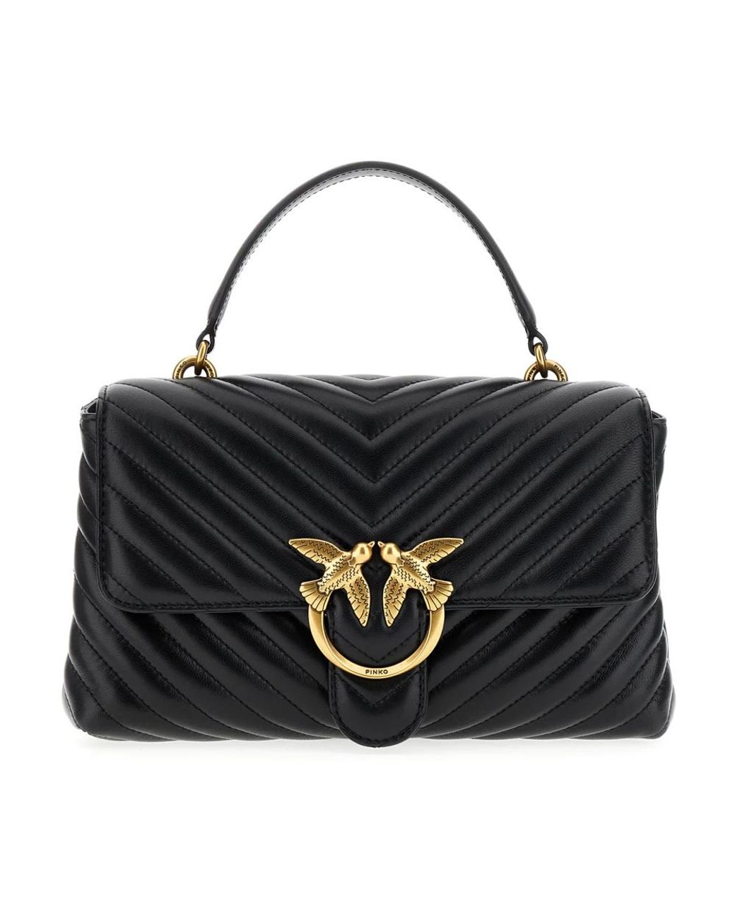 Pinko Love Lady Puff Classic is a quilted leather shoulder bag defined by its chevron matelassé and signature Love Birds buckle. Designed for everyday use, it pairs compact storage with a stylish chain-and-leather strap for day-to-night wear. Key attributes: Black | Leather | Adjustable and removable chain-and-leather shoulder strap | Flap and button closure | Zipped centre divider pocket | Slip pocket | Chevron quilting pattern | Love Birds Diamond Cut buckle | Foldover flap | Gold-tone hardware | Microsuede-lined interior | Dimensions & fit: W 27 x H 16 x D 7 cm | Composition & care: Leather | Do not wash. Do not use bleach. Do not tumble dry. Do not iron. Do not dry clean. Colour: black