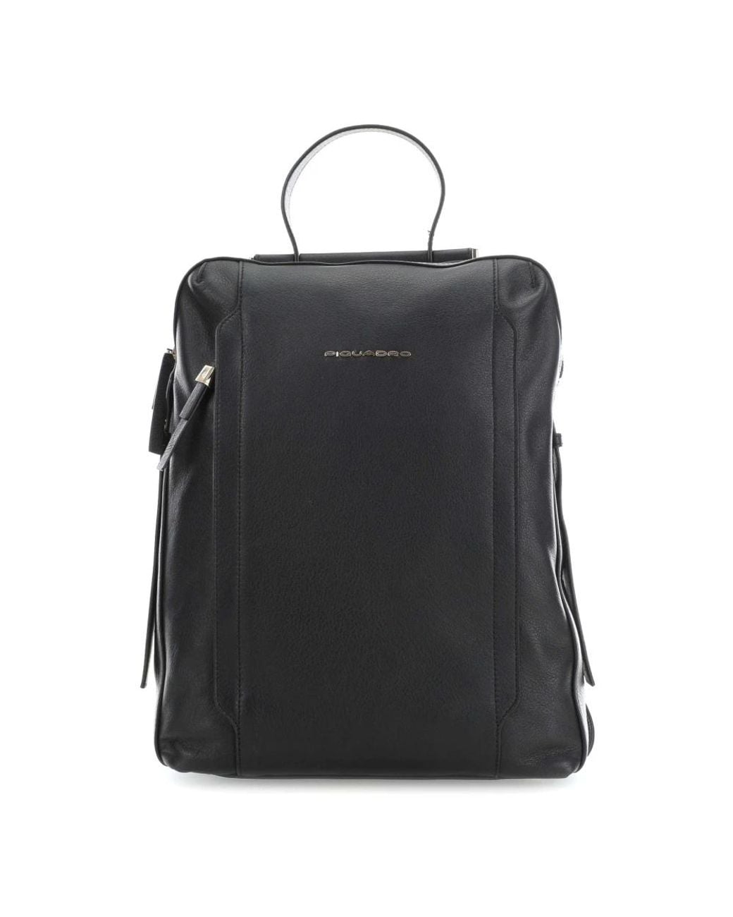 Piquadro backpack for women with front zip pocket, trolley attachment system, protective metal feet. Features a back system that closes with a zip, a leather handle with gold metal finish, polyester lining with logo, spacious main compartment suitable for A4 documents, key holder, pen holder, two internal pockets, padded laptop compartment, padded tablet/i Pad compartment. Made of grained cowhide leather. Dimensions: 28 x 36.5 x 11.00 cm. Weight: 860 gr. Colour: black