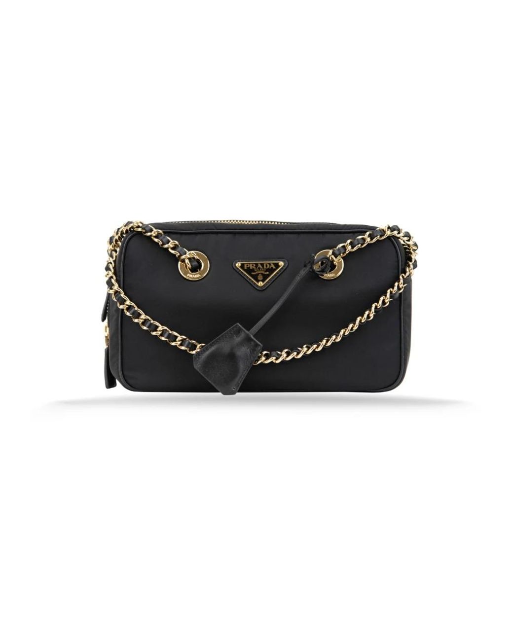 Elevate your style with this chic shoulder bag by Prada, crafted in Italy with a blend of fabric and leather for a sophisticated touch. Key attributes: Black | Fabric and Leather | Removable leather exterior detail | Envelope pockets | Gold-colored metal logo hardware | Colour: black