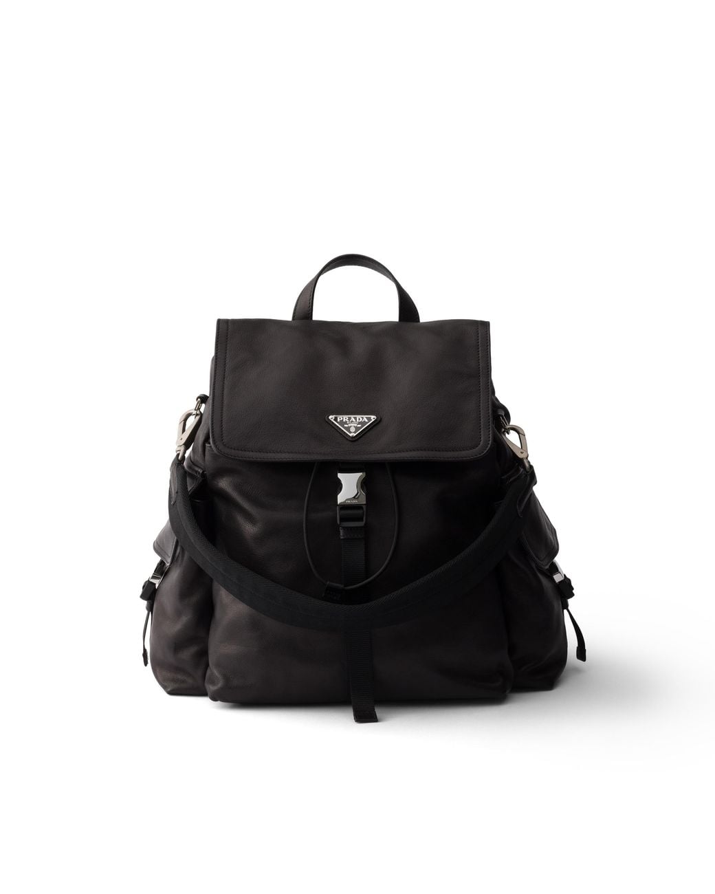 With removable padded Re-Nylon handle---Leather handle---Adjustable Re-Nylon harness straps---Enameled metal triangle logo on the flap---Closure with drawstring, flap and side-release buckle---Three external zipper pockets with flap and side-release buckles---Back pocket with magnet---Interior with zipper pocket and patch pocket---Logo-print Re-Nylon lining Colour: black