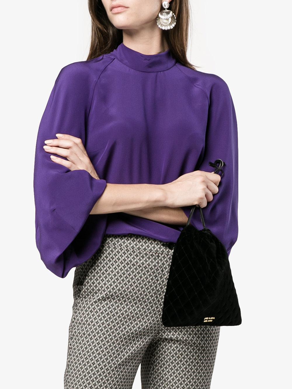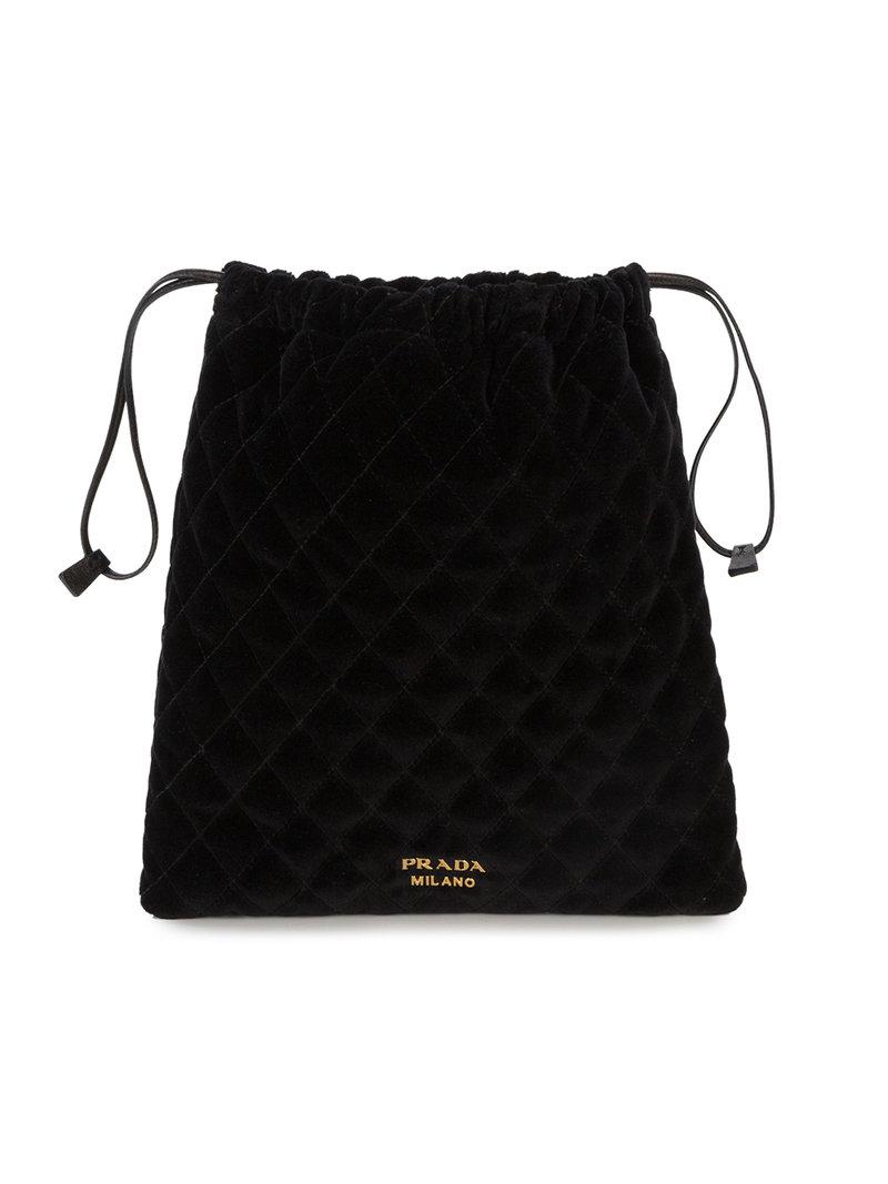 Go to FarfetchBlack velvet Black quilted velvet pouch from Prada featuring a drawstring fastening and a gold-tone logo plaque. Material:Leather/Velvet. Colour: black